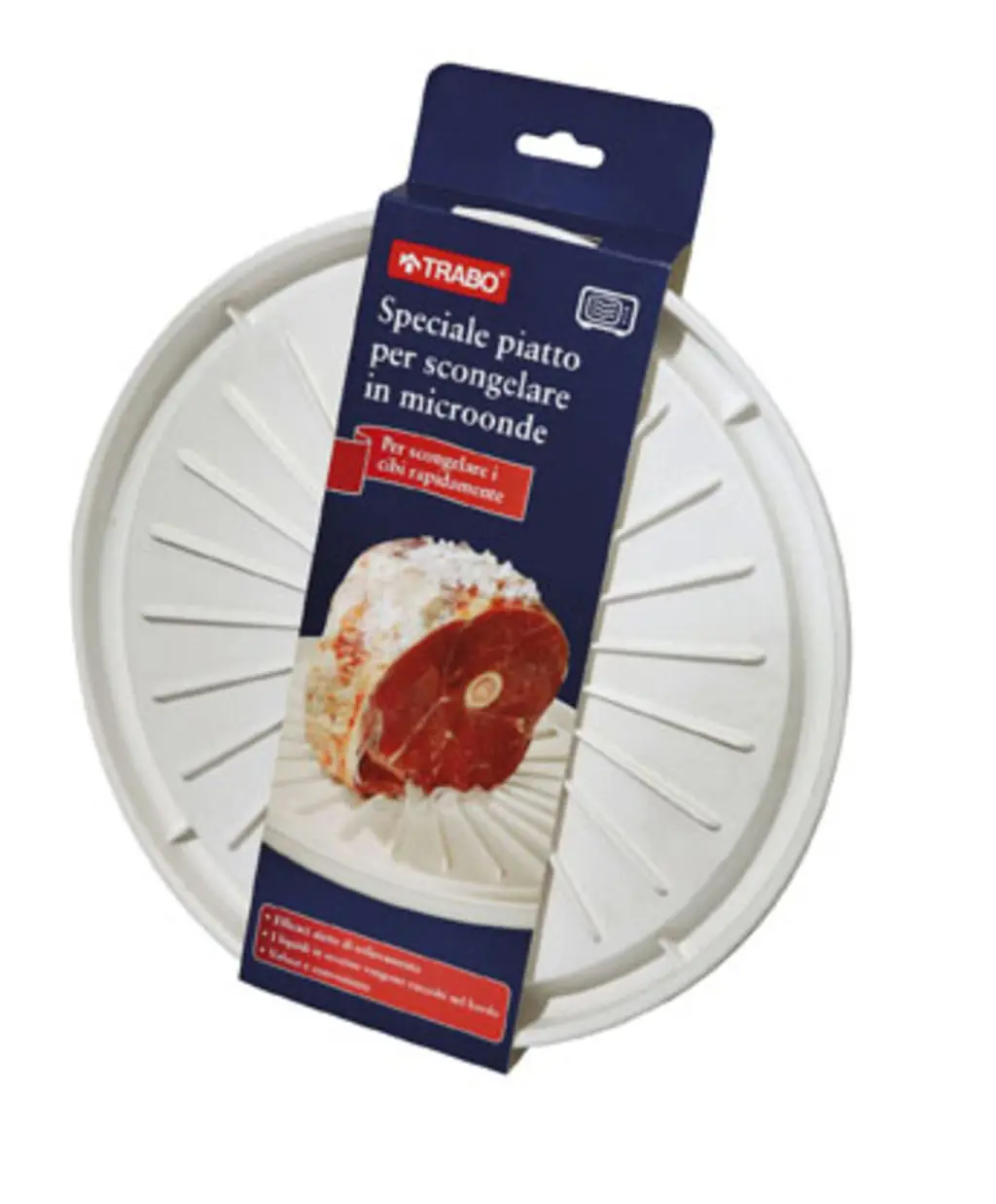 Speciale piatto in polipropilene per scongelare in microonde. I liquidi in eccesso vengono raccolti nel bordo. Lavabile in lavastoviglie.