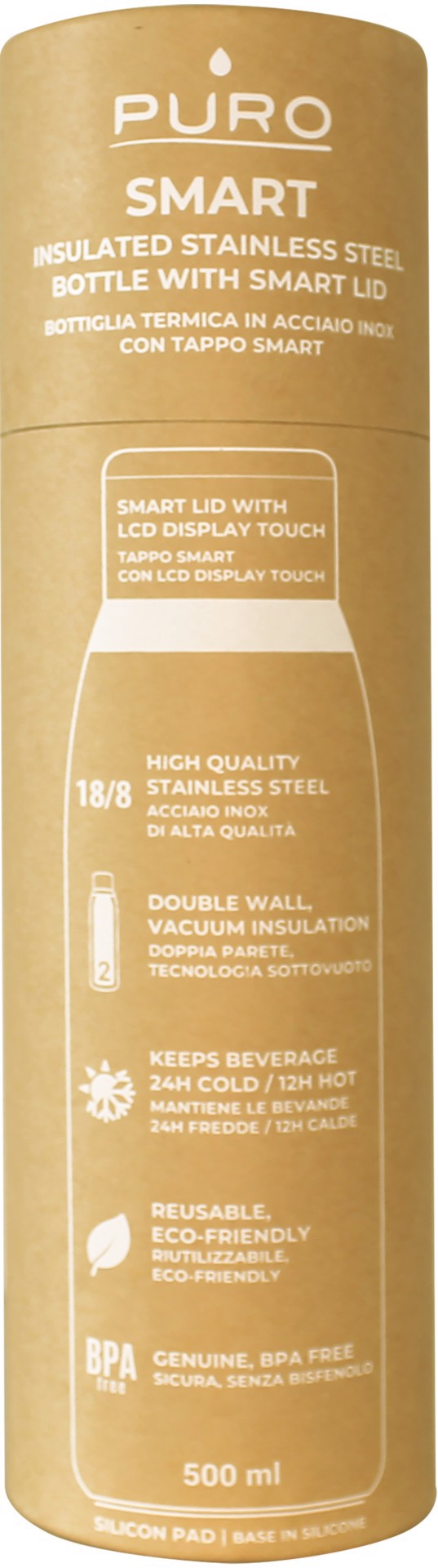 La bottiglia termica Smart di Puro nero opaca, raffinata ed elegante è pensata per migliorare il benessere della persona. Questa borraccia è da 500 ml e grazie alla doppia camera conserva le bevande calde per 12 ore e fredde per 24 ore. Il tappo con schermo LCD touch sensitive chiude ermeticamente la borraccia termica e indica la temperatura del liquido contenuto all?interno attraverso un segnale acustico facilmente impostabile, ricordando di bere ogni due ore. Quando il display è verde la temperatura della bevanda è ottimane, arancio quando è calda, rosso quando la temperatura è molto alta, sopra i 60°. La borraccia termica Puro Smart è realizzata in acciaio INOX, il miglior materiale per la conservazione delle bevande. Non si rovina e potrà essere riutilizzata infinite volte. L?acciaio inoltre non contiene bisfenolo (BPA Free), non arrugginisce a lascia inalterate le proprietà organolettiche del liquido contenuto al suo interno. Il processo di produzione delle bottiglie termiche di Puro è a bassa emissione di CO2.