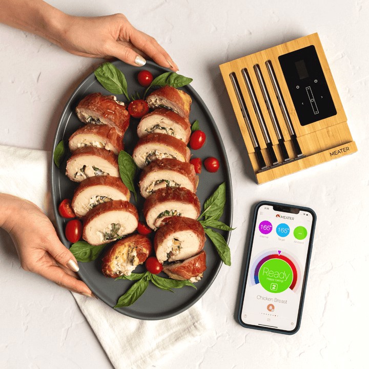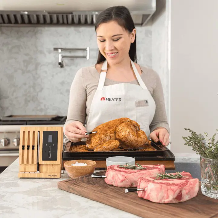 Sviluppato con tecnologia all'avanguardia combinata con un'insaziabile passione per cibi appetitosi e cucinati alla perfezione. MEATER Block è il leggendario strumento di cottura dotato di 4 sonde numerate. Bistecca rare per te, medium per il tuo ospite, medium rare per un tuo parente e ben cotta per nessuno. Clip sonda incluse. Nota: a causa della struttura in bambù naturale del caricatore, il colore del Brown Sugar può variare. Caratteristiche Raggio più lungo: estensione della portata da Bluetooth a Wi-Fi integrata fino a 50m. Modalità stand-alone: cucina senza l'uso del tuo smartphone. 4 sonde: i doppi sensori di temperatura in ciascuna sonda possono monitorare la temperatura interna della carne fino a 100°C e la temperatura ambiente/esterna fino a 275°C contemporaneamente. Sistema di cottura guidato: ti guida attraverso ogni fase del processo di cottura per garantire risultati perfetti e consistenti. Puoi anche impostare avvisi/notifiche personalizzate in base alla temperatura e/o al tempo. Algoritmo avanzato per la stima del tempo: può stimare per quanto tempo durerá la cottura e far riposare la pietanza per pianificare al meglio il tuo tempo.