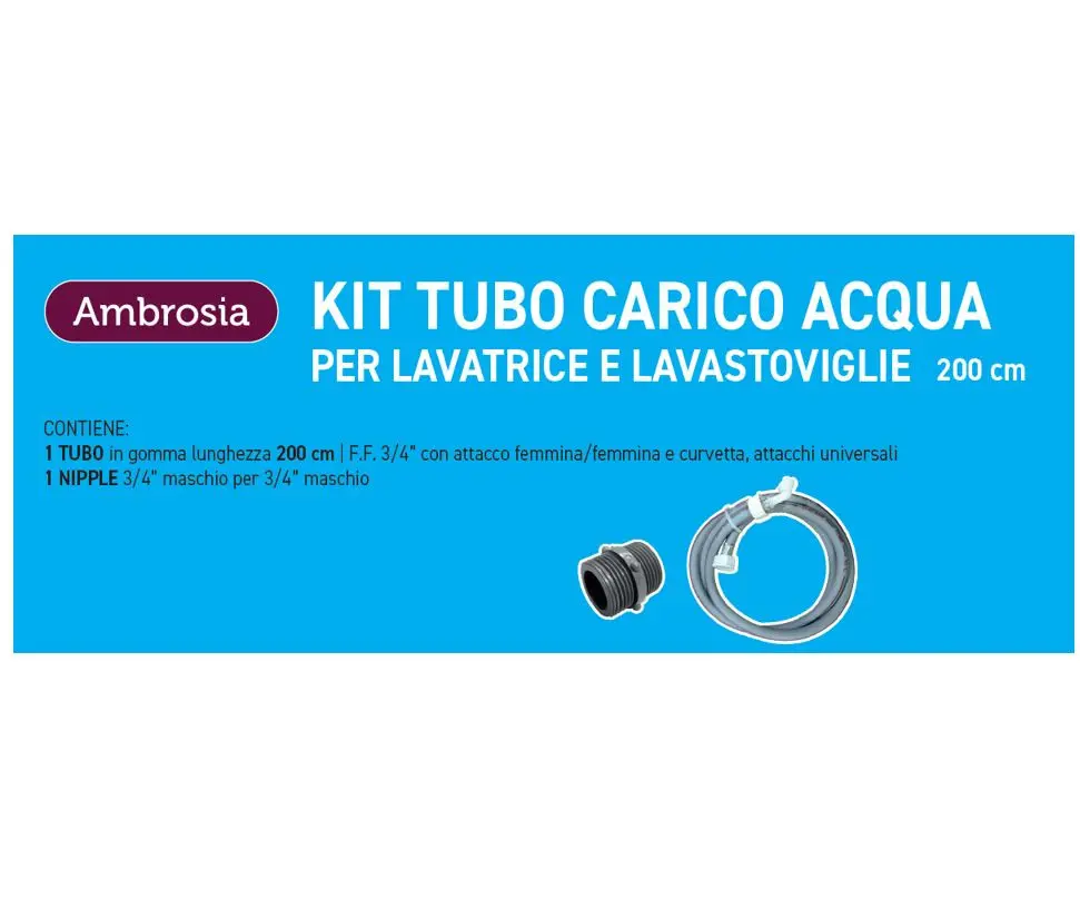 Contenuto della scatola: 1 TUBO in gomma lunghezza 200 cm | F.F. 3/4” con attacco femmina/femmina e curvetta, attacchi universali 1 NIPPLE 3/4” maschio per 3/4” maschio