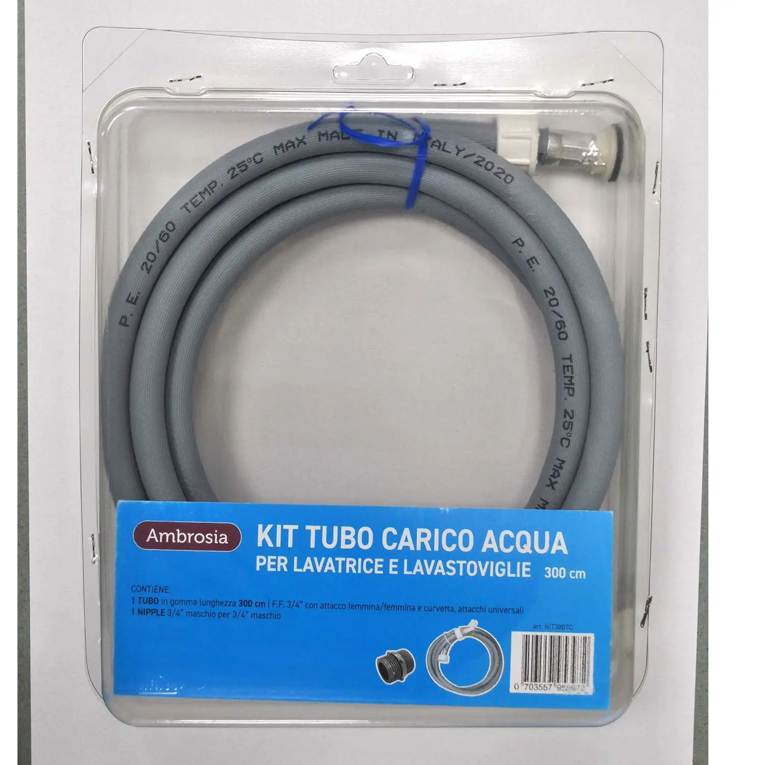 Contenuto della scatola: 1 TUBO in gomma lunghezza 300 cm | F.F. 3/4” con attacco femmina/femmina e curvetta, attacchi universali 1 NIPPLE 3/4” maschio per 3/4” maschio