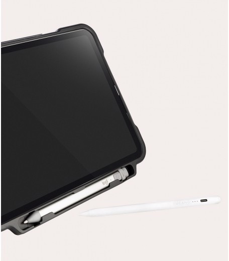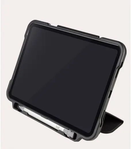 Custodia ultra-protettiva per iPad 10th gen (2022), realizzata parzialmente in plastica riciclata, con scocca posteriore anti-shock, formata da un bordo perimetrale in TPU e da un’ampia sezione trasparente in policarbonato. La flap anteriore funziona da standup per differenti posizioni di utilizzo e la pratica chiusura magnetica attribuisce una maggiore protezione al device. Alunno è dotato di alloggio interno per Apple Pencil o Logitech Crayon. Test military standard.