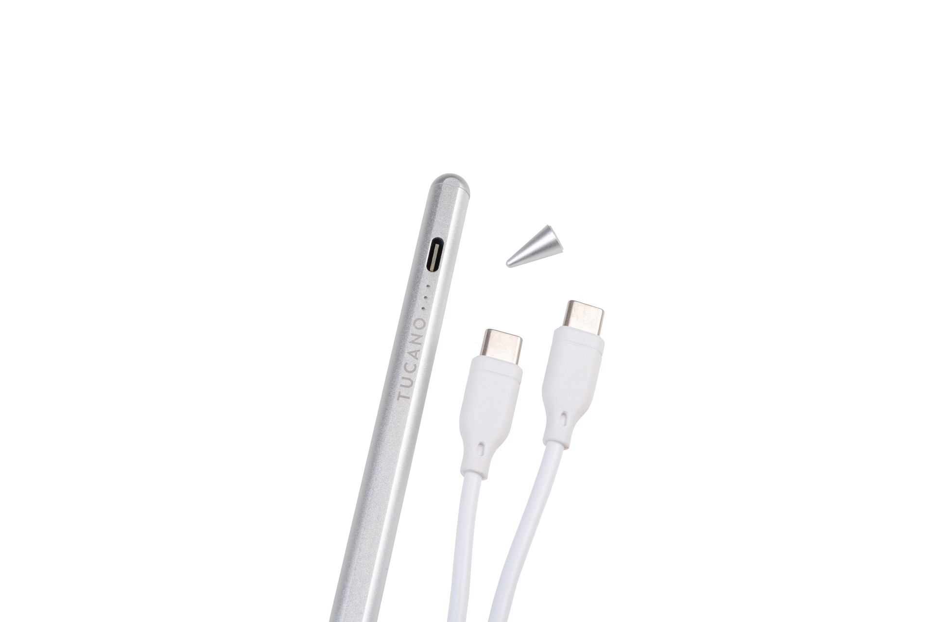 Penna capacitiva attiva progettata per tuti modelli di iPad con tempo di ricarica di 30 minuti e con un'autonomia di 8/10 ore. Dotata di tecnologia palm rejection, che ignora i tocchi involontari del palmo della mano, la Tucano Pencil è sensibile all'inclinazione e non necessita di associazione Bluetooth essendo riconosciuta automaticamente dal dispositivo. Il supporto magnetico integrato, consente di agganciare la Tucano Pencil sul lato esterno dell'iPad (solo nei modelli compatibili). Cavo USB-C per la ricarica e 2 punte di ricambio inclusi nella confezione.