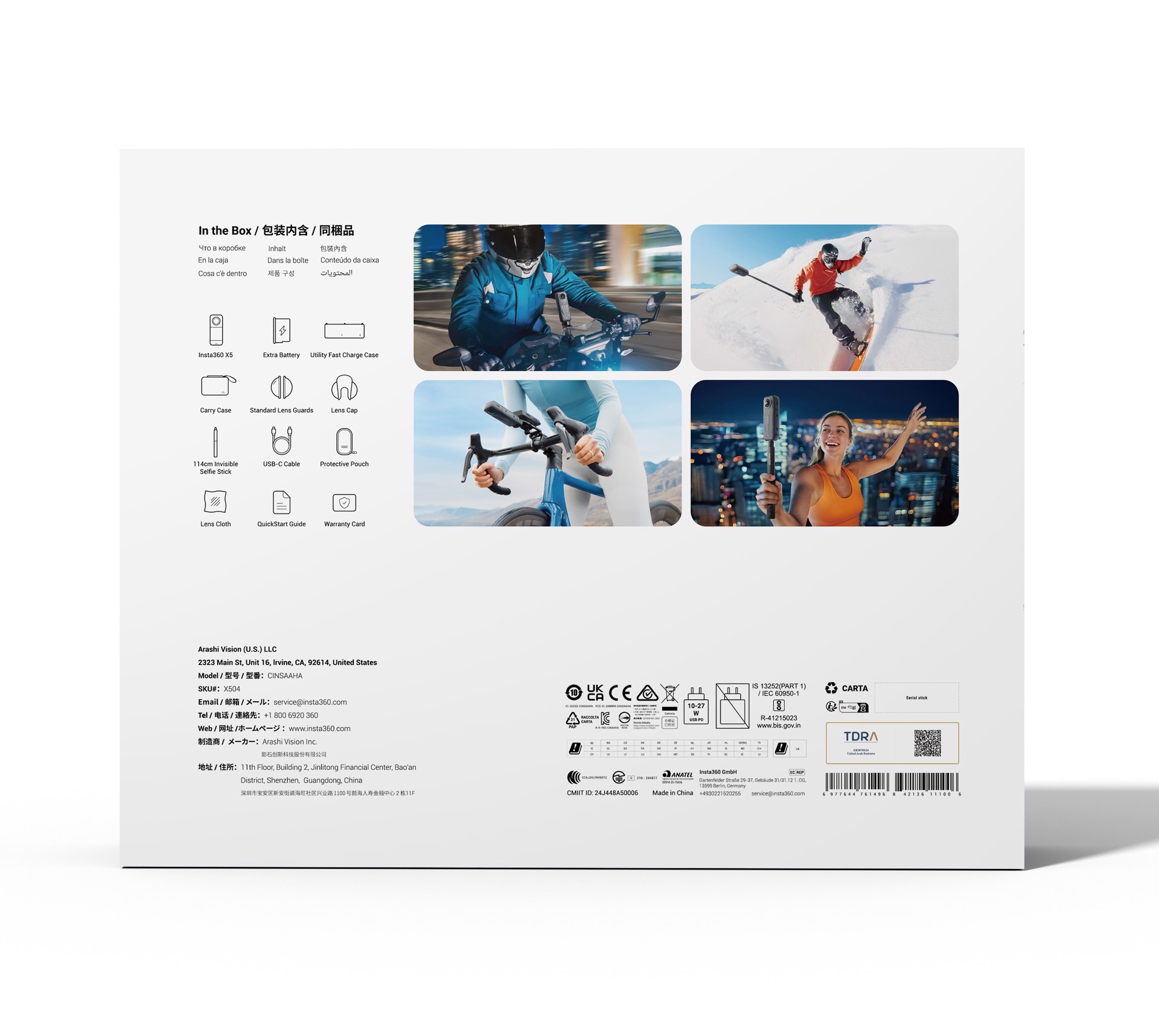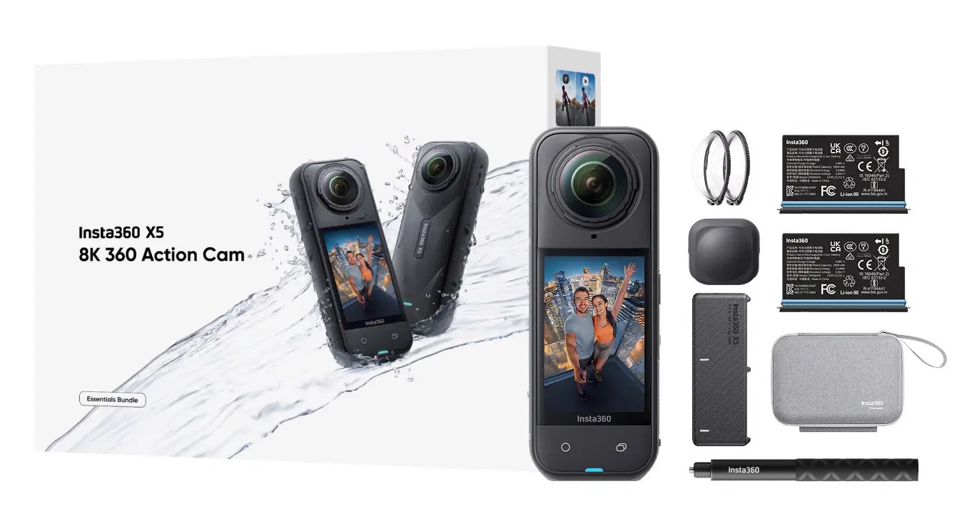 Insta360 X5 Bundle. Tipologia HD: 8K Ultra HD, Risoluzione massima video: 7680 x 3840 Pixel, Frequenza massima dei fotogrammi: 120 fps. Megapixel totali: 72 MP, Dimensioni sensore ottico: 25,4 / 1,28 mm (1 / 1.28"), Risoluzione massima immagine: 11904 x 5952 Pixel. Angolo di campo visivo: 360°, Lunghezza focale massima (35mm film equiv): 6 mm. Sensibilità ISO: 100, 125, 160, 200, 250, 320, 400, 500, 640, 800, 1000, 1250, 1600, 2000, 2200, 2250, 2500, 3200,..., Correzione espozione: ± 4EV. Sistema audio: Stereo