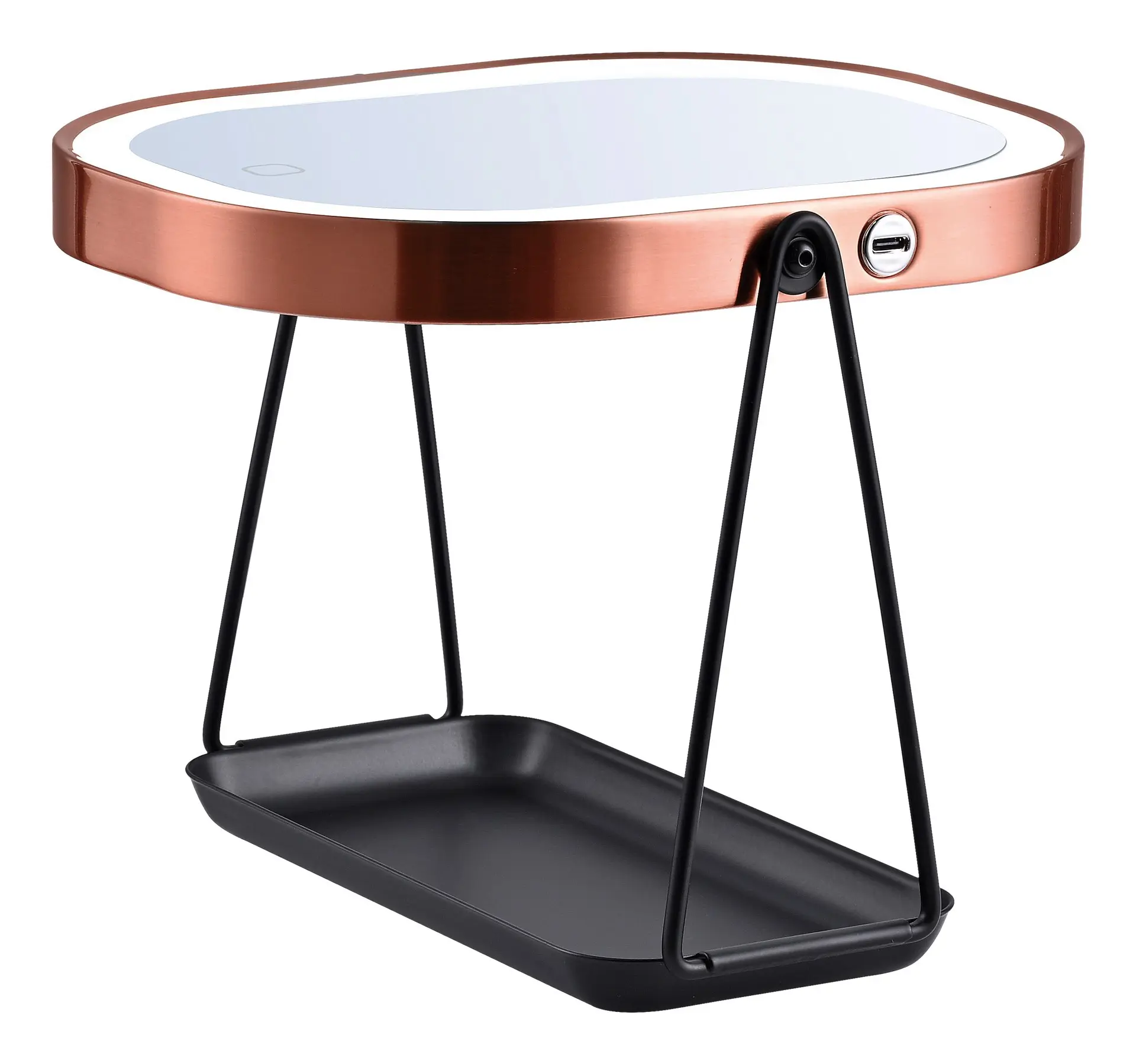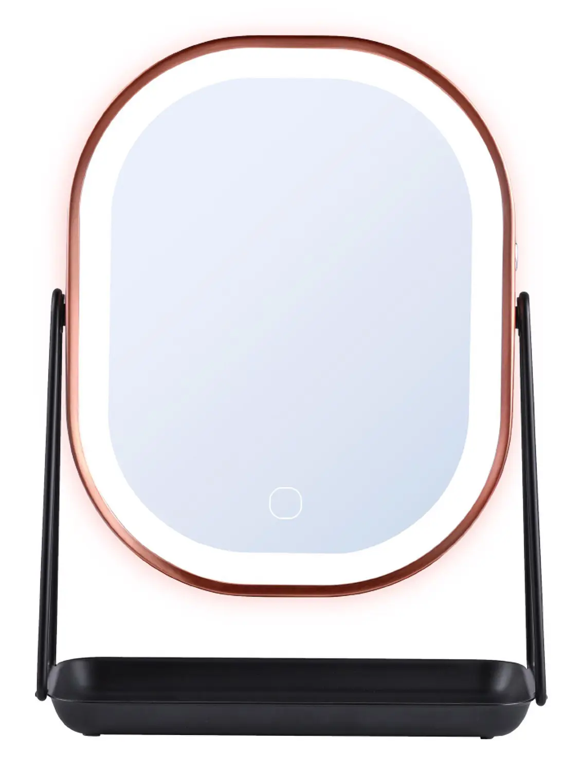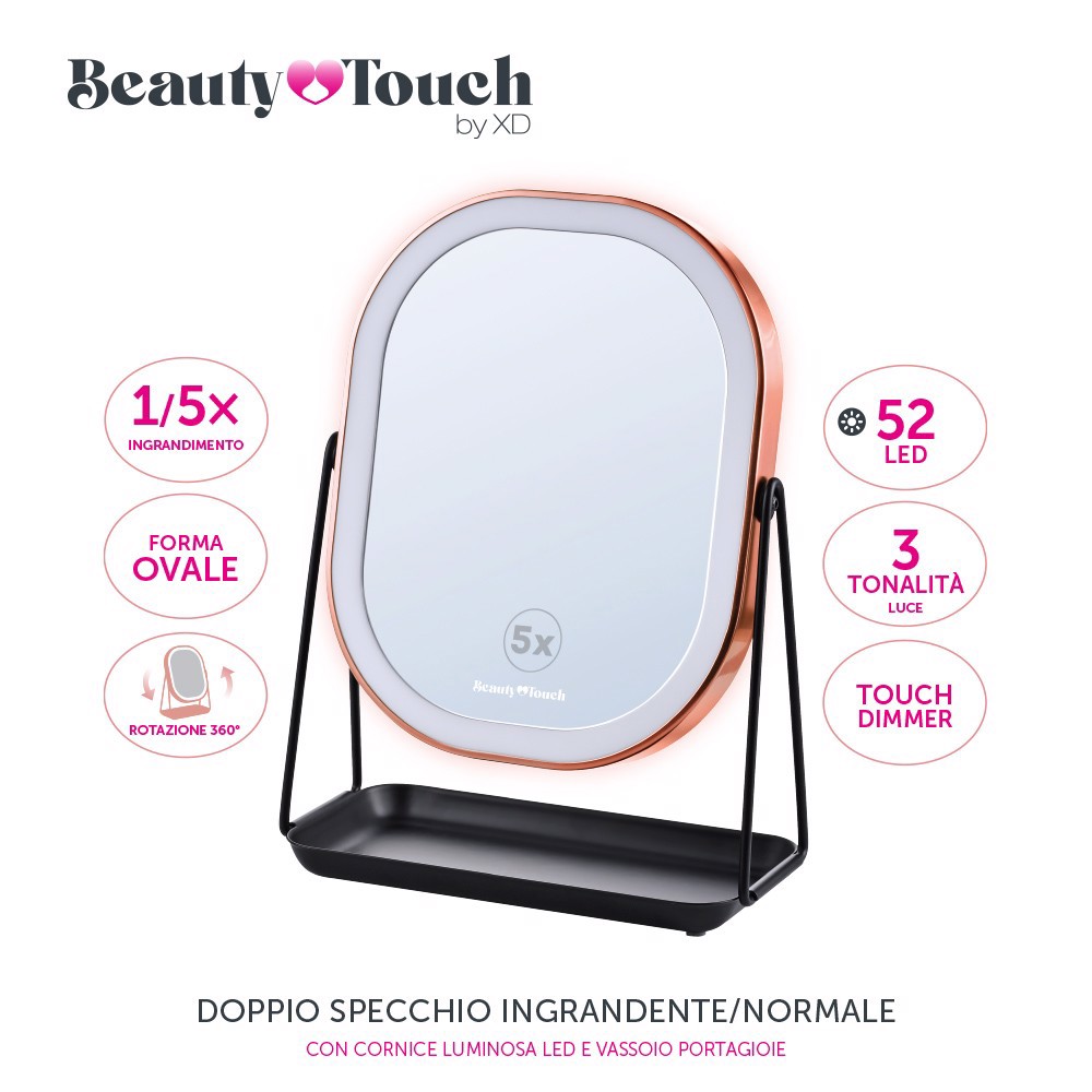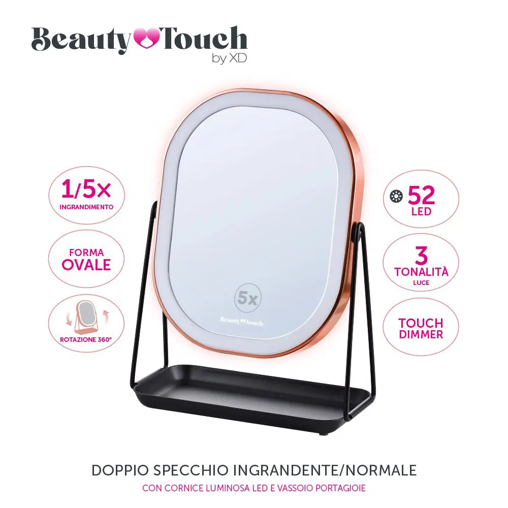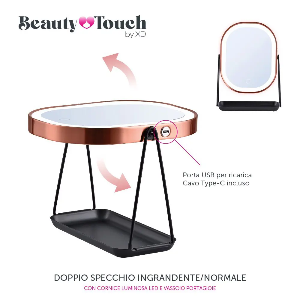BASE MULTIFUNZIONE la base integrata dello specchio funge da pratico portagioie e portatrucchi, perfetta per riporre anelli, orecchini, mascara, rossetti, smalti o pinzette, tenendo tutto a portata di mano.