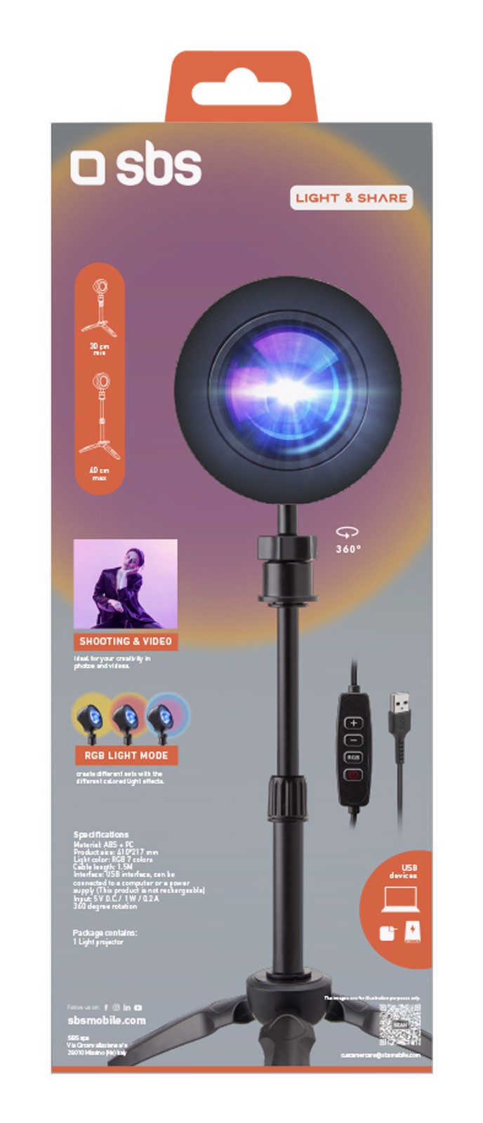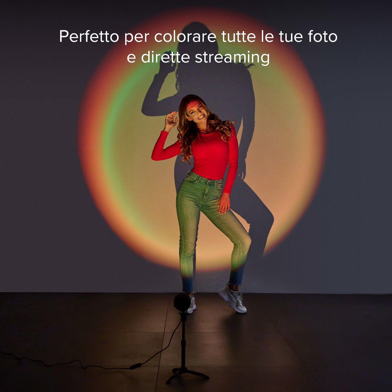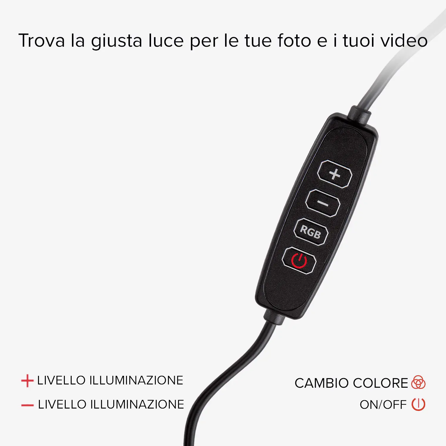 La luce LED multicolor da sfondo è alimentata attraverso il cavo con connettore USB integrato da collegare in una fonte di energia compatibile. Così avrai sempre pronto all’uso il tuo accessorio per scattare selfie e registrare dirette streaming.