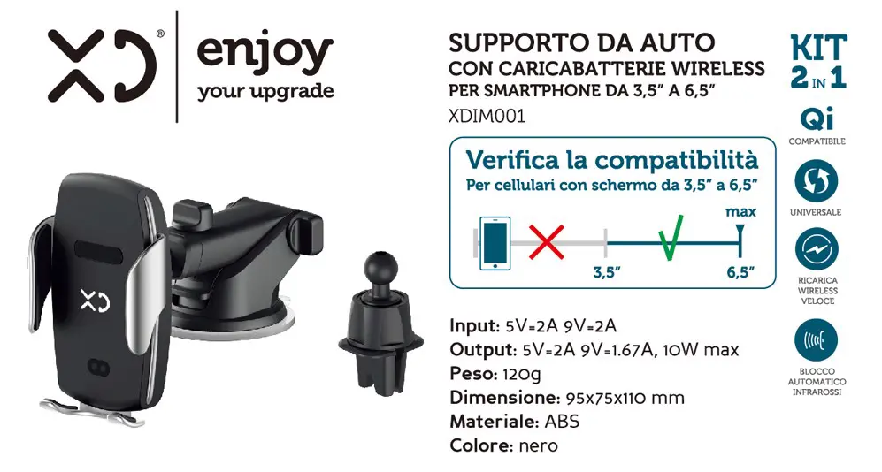 XD Enjoy Kit 2 in 1 - supporto da auto con caricabatterie wireless
