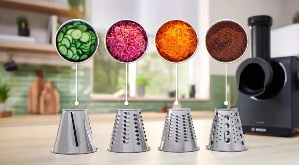 - Tritatutto a 4 cilindri (triturazione fine e grossolana, affettatura, granitura) per affettare facilmente i cetrioli, grattugiare il formaggio o sminuzzare le carote per gustose insalate. I fusti sono a forma di cono per facilitare la lavorazione degli ingredienti senza che i loro resti rimangano incastrati.
