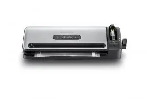 Basta sfiorare un pulsante perché l’apparecchio elimini automaticamente l’aria dal sacchetto; le spie di avanzamento vi avvertono quando viene creato il sottovuoto. Una volta eliminata tutta l’aria, l’apparecchio sigilla a caldo il sacchetto, bloccando la freschezza al suo interno.