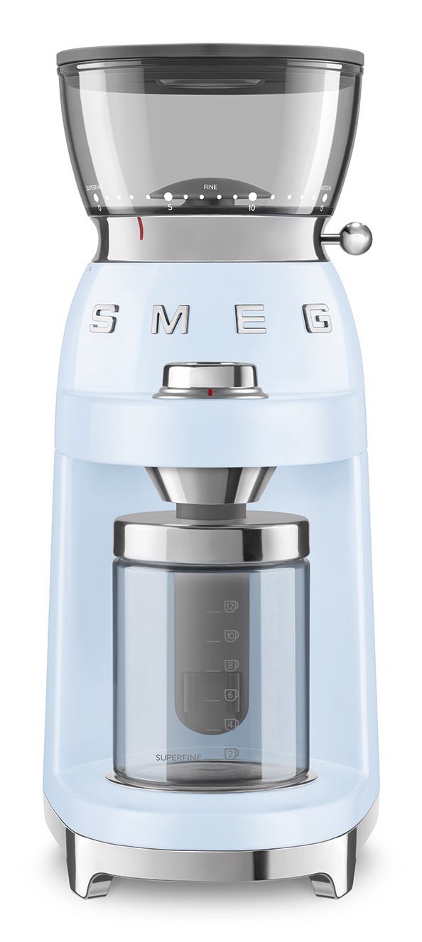 Smeg CGF03PBEU. Tipo di prodotto: Macinacaffè elettrico, Capacità caffè in grani: 240 g, Tipo di macina: Macinino conico. Potenza: 150 W, Tensione di ingresso AC: 220-240 V, Frequenza di ingresso AC: 50-60 Hz. Peso: 3,1 kg, Larghezza: 150 mm, Profondità: 220 mm. peso dell'imballaggio di carta: 680 g, Peso dell'imballaggio in plastica: 200 g, Larghezza imballo: 275 mm. Quantità per container intermodale (20 piedi): 1015 pz, Quantità per container intermodale (40 piedi): 2075 pz, Quantità per contenitore intermodale (40pd, HC): 2280 pz