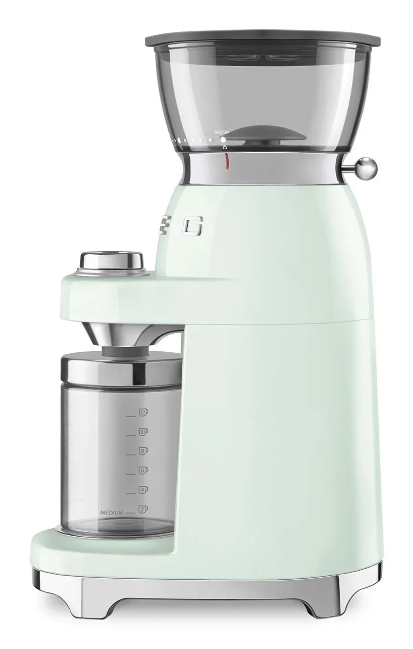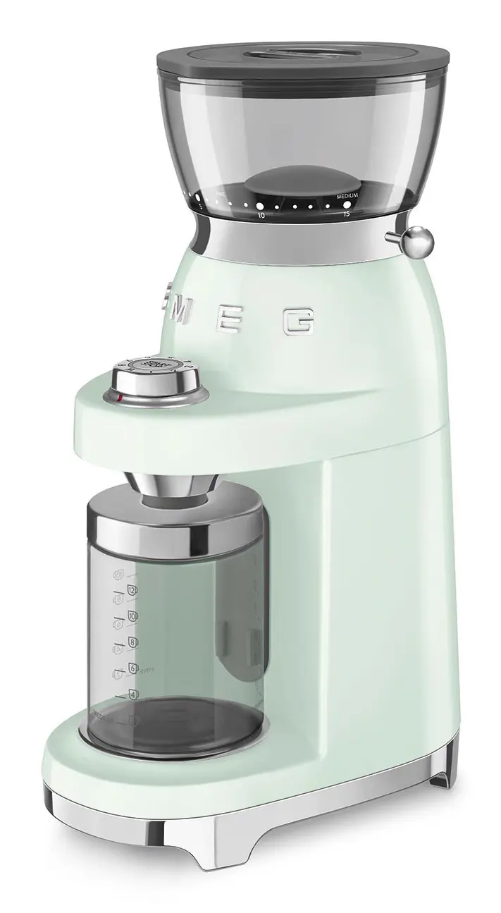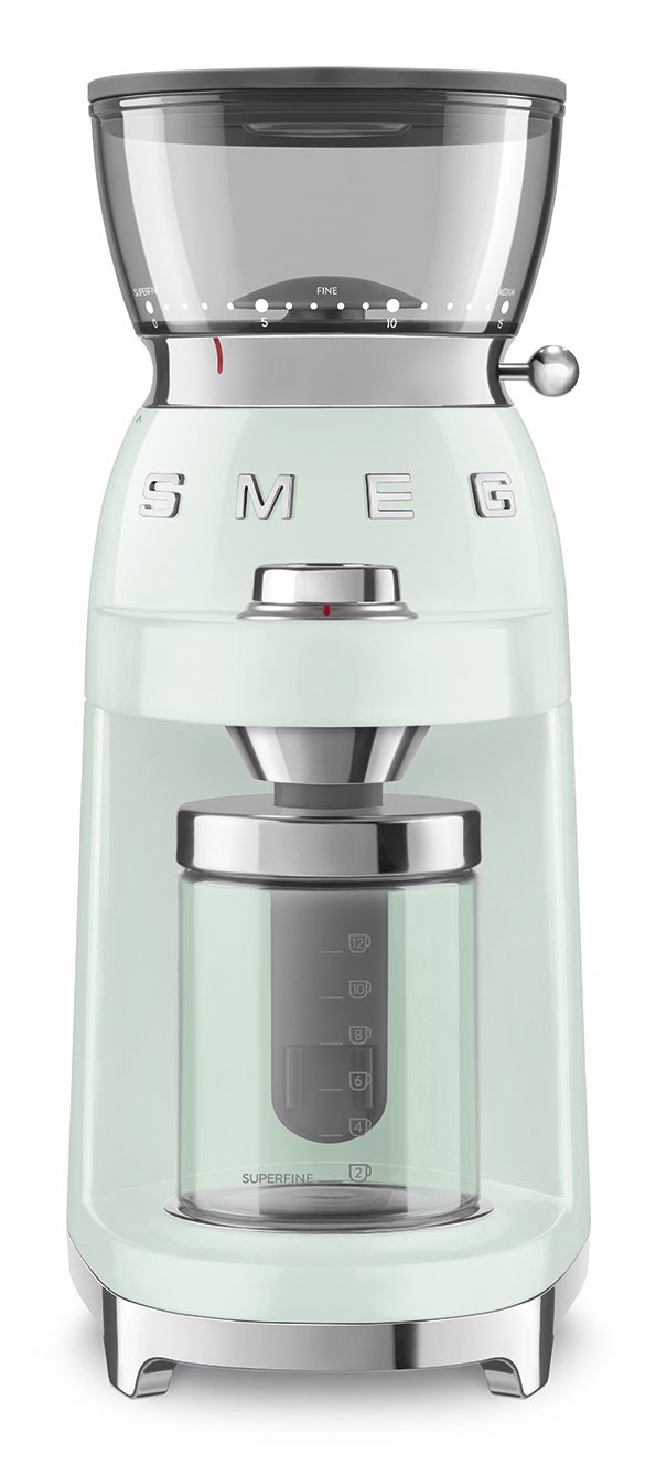Smeg CGF03PGEU. Tipo di prodotto: Macinacaffè elettrico, Capacità caffè in grani: 240 g, Tipo di macina: Macinino conico. Potenza: 150 W, Tensione di ingresso AC: 220-240 V, Frequenza di ingresso AC: 50-60 Hz. Peso: 3,1 kg, Larghezza: 150 mm, Profondità: 220 mm. peso dell'imballaggio di carta: 680 g, Peso dell'imballaggio in plastica: 200 g, Larghezza imballo: 275 mm. Quantità per container intermodale (20 piedi): 1015 pz, Quantità per container intermodale (40 piedi): 2075 pz, Quantità per contenitore intermodale (40pd, HC): 2280 pz