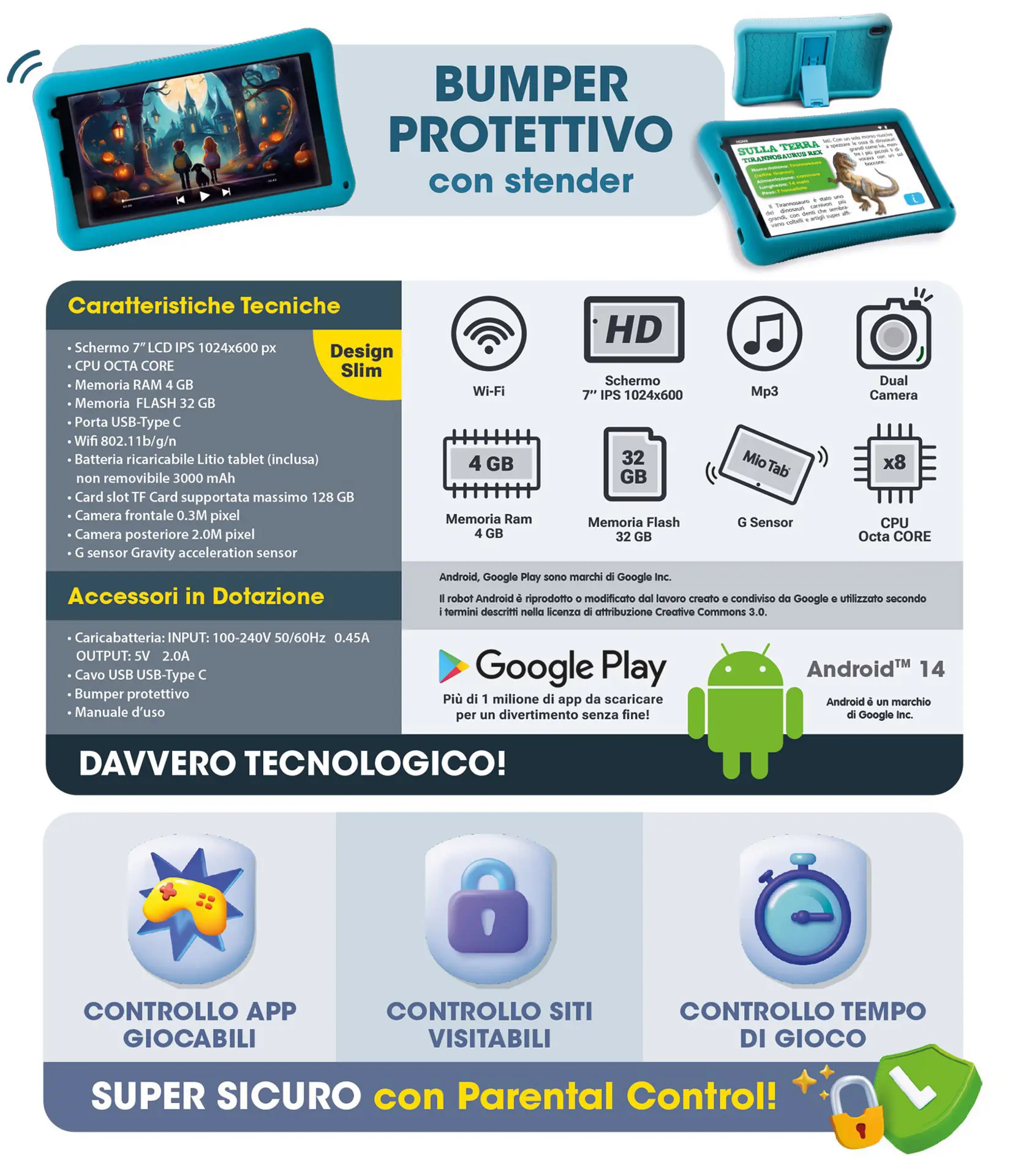 Lisciani 114214, 17,8 cm (7"), 1024 x 600 Pixel, 32 GB, 4 GB, Android 14, Nero