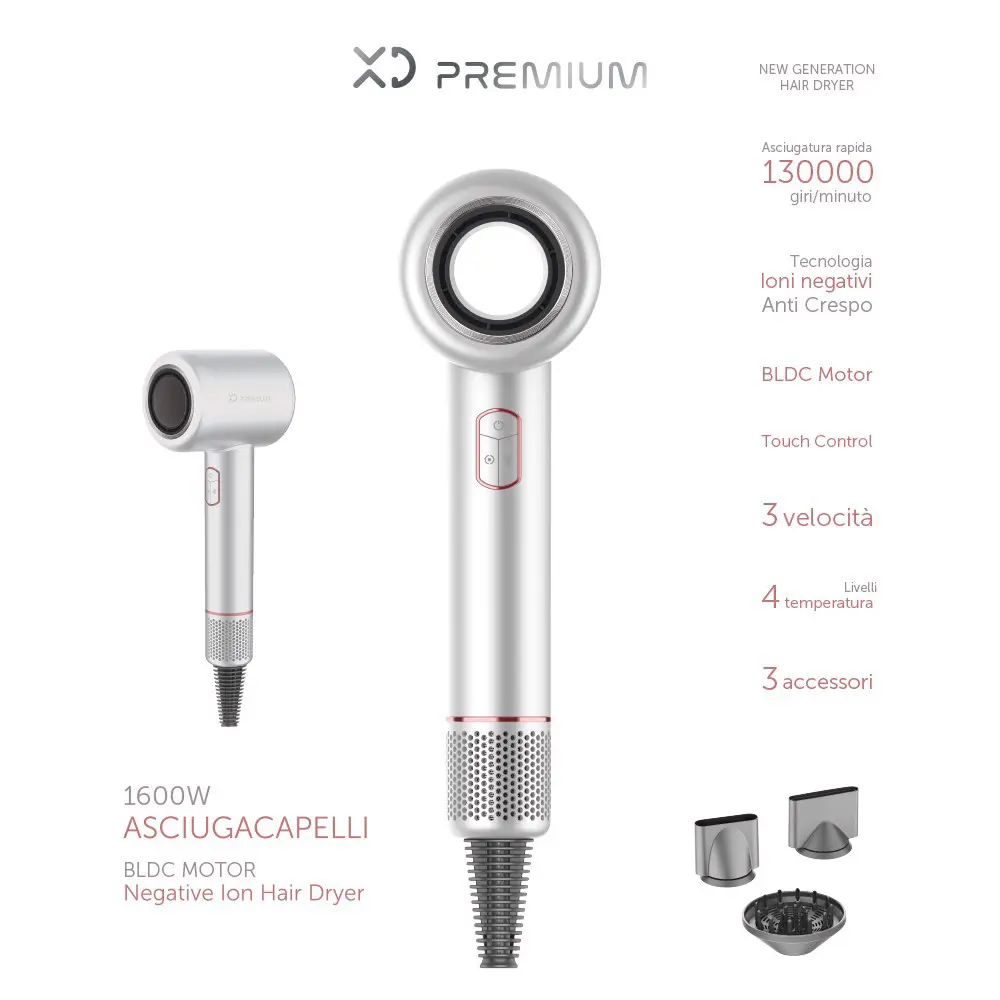 XD Enjoy XDMIS6800. Velocità motore: 130000 Giri/min. Colore del prodotto: Bianco, Rose Gold, Colorazione superficie: Monocromatico, Lunghezza cavo: 2,2 m. Potenza: 1600 W, Tensione di ingresso AC: 220 - 240 V, Frequenza di ingresso AC: 50/60 Hz. Larghezza: 300 mm, Profondità: 98 mm, Altezza: 80 mm