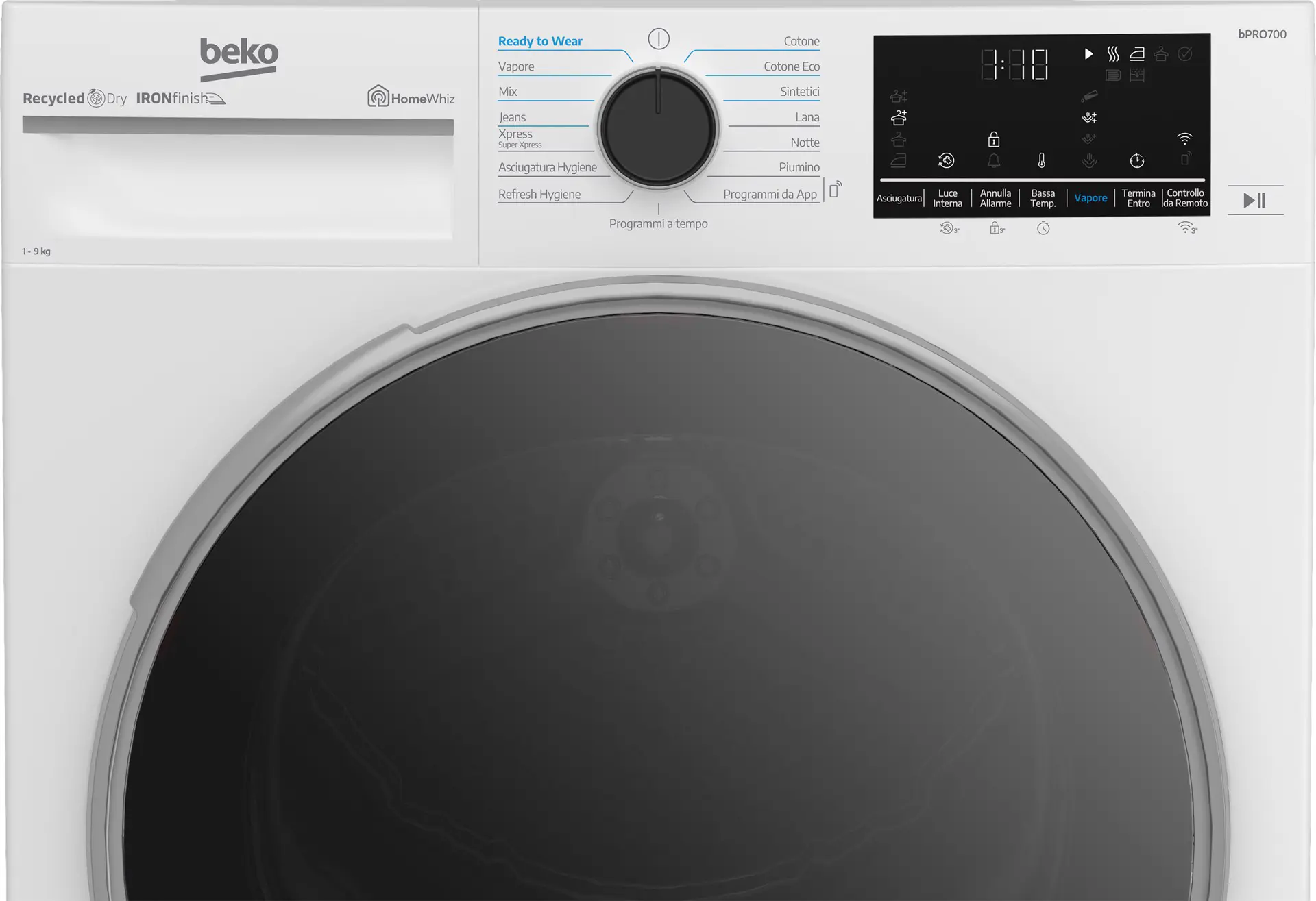 | Programmi di asciugatura | Cotone, Jeans/denim, Hygienic drying, Piumino/piumone, Lana, Mix, Silent, 50min, Vapore, Ready to wear, Hygienic freshen-up, Cotton eco, Sintetico, Programmato, Download cycle |