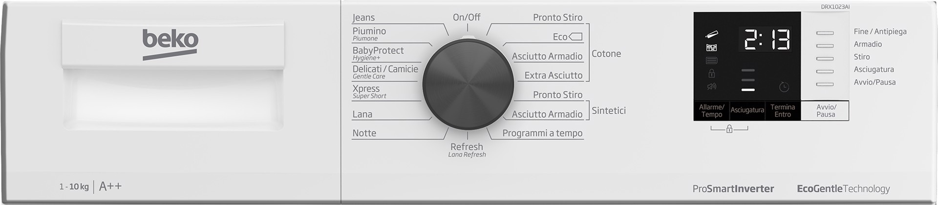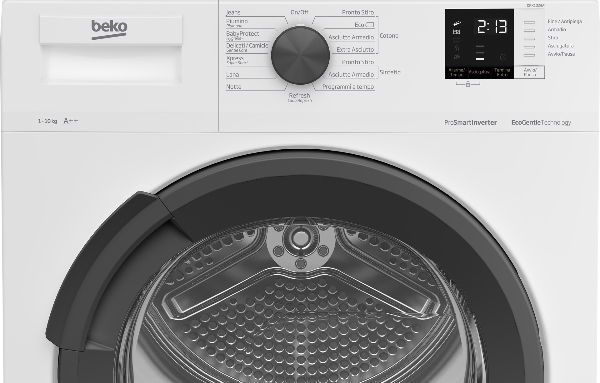 Beko DRX1023AI: Asciugatrice 10kg, Classe E, Inverter. Posizionamento dell'apparecchio: Libera installazione, Tipo di carica: Caricamento frontale, Sistema di asciugatura: Pompa di calore. Capacità cestello: 10 kg, Classe di efficienza della condensazione: C, Programmi di asciugatura: Cura del bambino, Cotone, Delicati/Seta, Piumino/piumone, Eco, Jeans/denim, Mix, Sport, Sintetico. Partenza ritardata: 24 h. Classe efficienza energetica: E, Consumo energetico per 100 cicli: 150 kWh, Fonte di calore: Elettrico. Profondità: 540 mm, Larghezza: 597 mm, Altezza: 846 mm