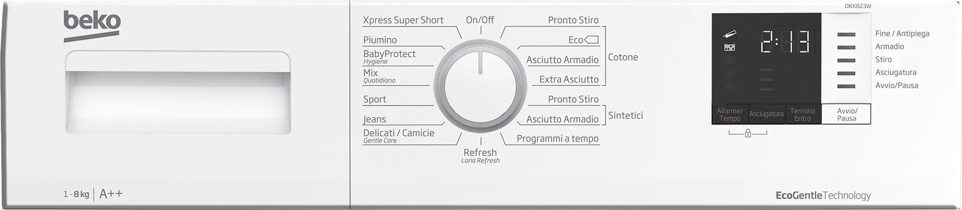 | Programmi di asciugatura | Cotton iron dry, Delicati/Seta, Piumino/piumone, Express Wash&Dry, Cura delicata, Igiene/Allergy Care, Jeans/denim, Mix, Outdoor/sport, Refresh, Synthetics cupboard dry, Synthetics iron dry, Programmato, Lana |