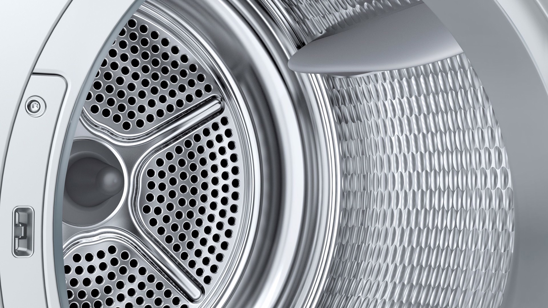 Le asciugatrici a pompa di calore con Condensatore autopulente proteggono i tuoi capi e mantengono un'alta efficienza energetica. Il condensatore si pulisce automaticamente fino a quattro volte durante il processo di asciugatura, mantenendo il massimo rendimento energetico, ciclo dopo ciclo. Le asciugatrici a pompa di calore Bosch sono progettate per funzionare in modo efficiente e asciugare i vestiti delicatamente e alla perfezione.