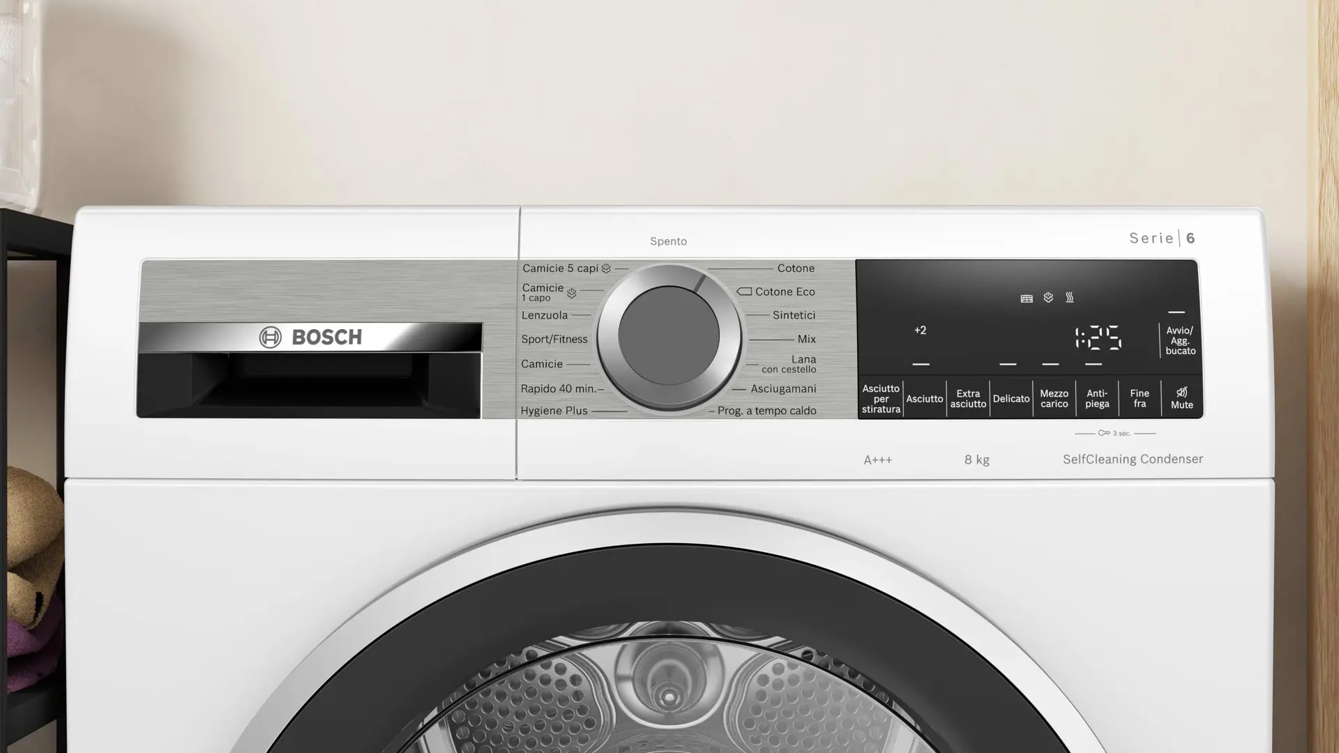 | Programmi di asciugatura | Biancheria da letto, Camicia/maglietta, Cotone, Eco, Hygienic freshen-up, Ferro da stiro a secco, Mix, Rapido, Sport, Sintetico, Asciugamano, Lana |