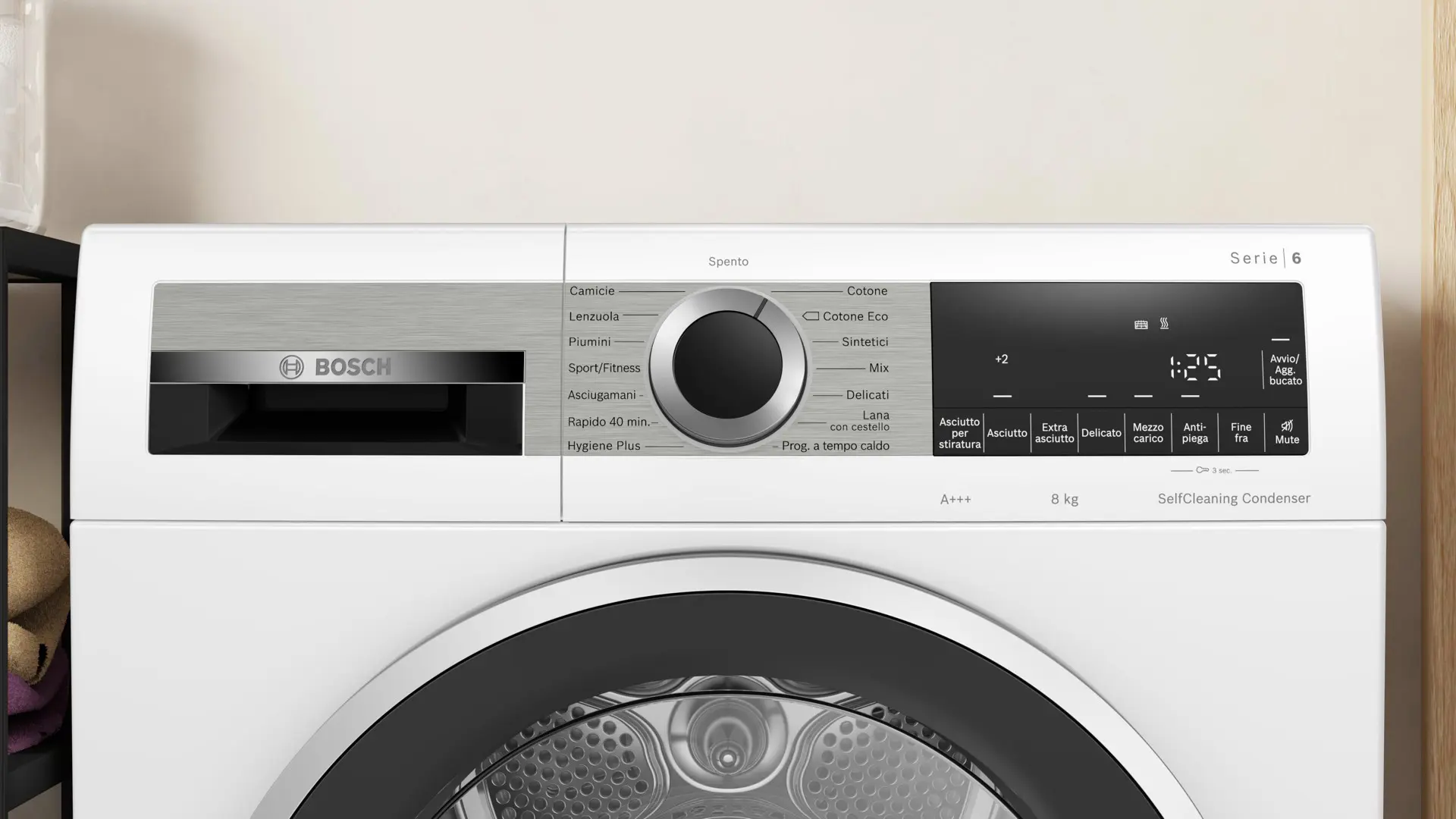 | Programmi di asciugatura | Biancheria da letto, Camicia/maglietta, Cotone, Eco, Hygienic freshen-up, Mix, Rapido, Sport, Sintetico, Asciugamano, Lana |