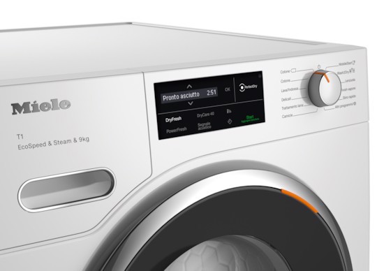 Miele TWL780WP EcoSpeed & Steam & 9kg, Libera installazione, Caricamento frontale, Pompa di calore, Bianco, Manopola, Touch, Sinistra