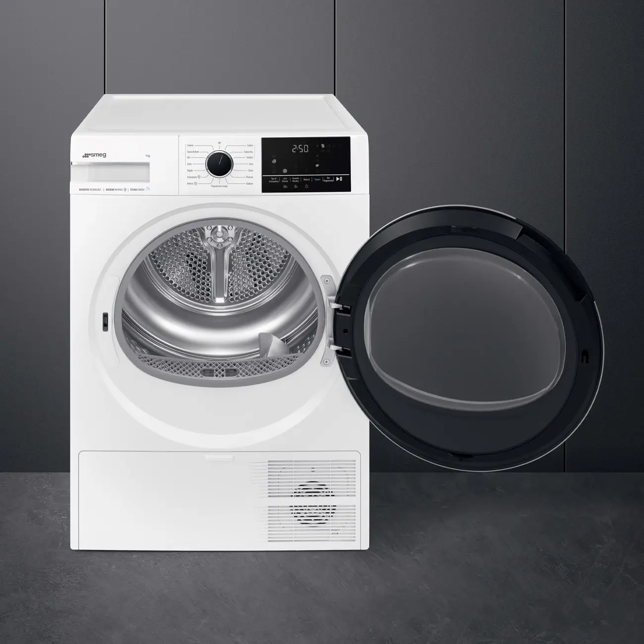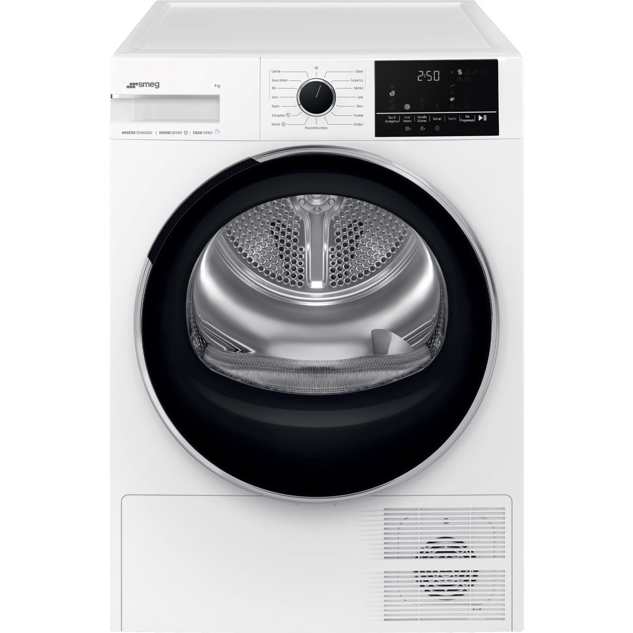 Smeg DNP09SEB. Posizionamento dell'apparecchio: Libera installazione, Tipo di carica: Caricamento frontale, Sistema di asciugatura: Pompa di calore. Capacità cestello: 9 kg, Classe di efficienza della condensazione: B, Programmi di asciugatura: Camicia/maglietta, Cotone, Cotton eco, Piumino/piumone, Hygienic drying, Hygienic freshen-up,.... Partenza ritardata: 24 h. Classe efficienza energetica: B, Consumo energetico per 100 cicli: 92 kWh, Consumo energetico: 0,92 kWh. Profondità: 671 mm, Larghezza: 598 mm, Altezza: 846 mm