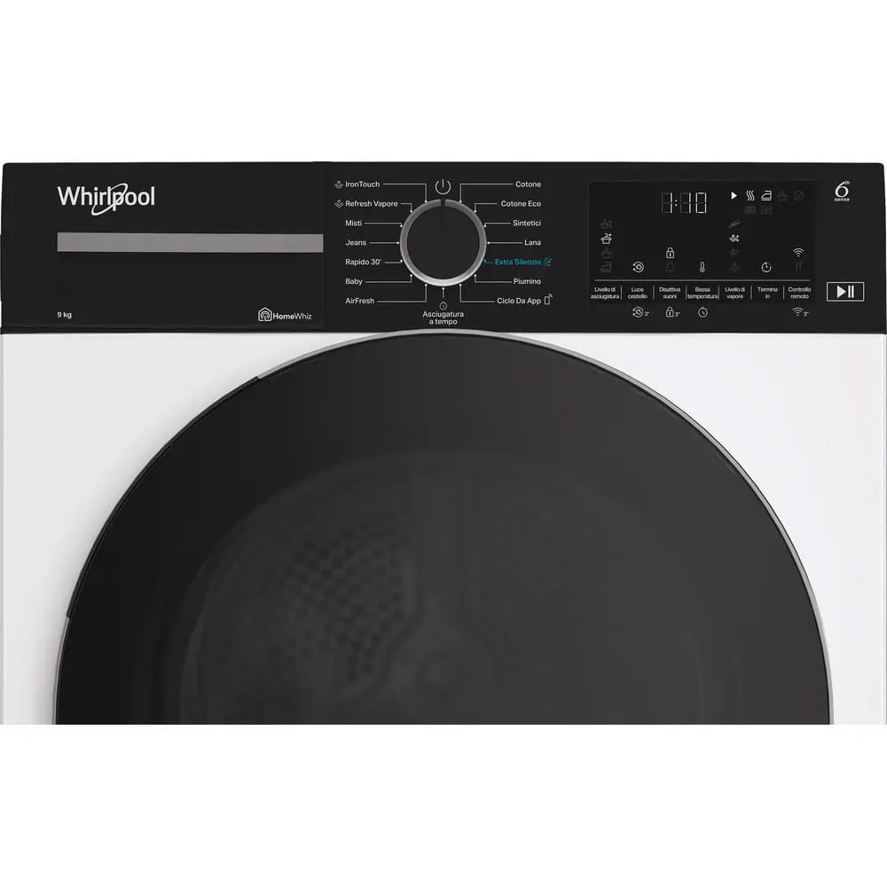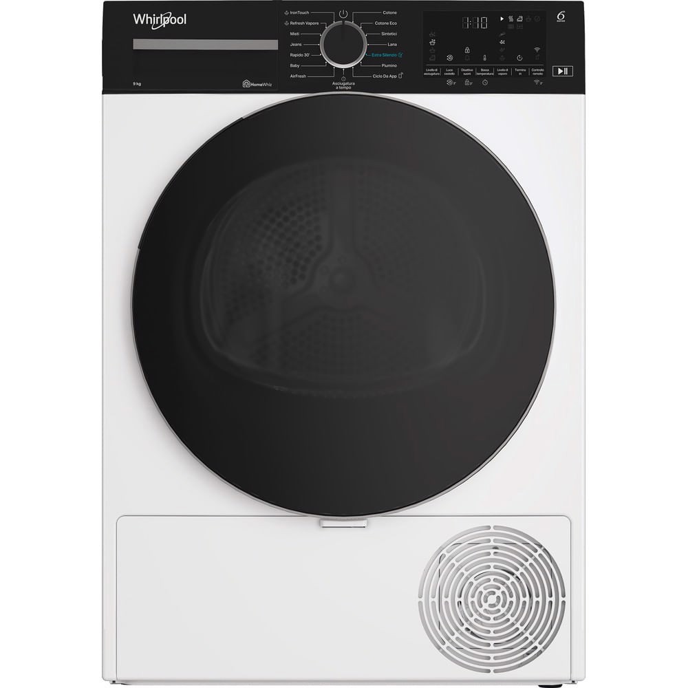 Caratteristiche di questa asciugatrice a libera installazione Whirlpool: eccezionale capacità del cestello di 9,0kg per non restare mai senza spazio. Esclusiva tecnologia 6° SENSO che monitora costantemente il livello di umidità nel tamburo per proteggere i tuoi vestiti e garantire un'asciugatura perfetta. Funzione di connessione che consente all'elettrodomestico di ricevere informazioni riguardo il ciclo di lavaggio utilizzato e regolare le impostazioni di conseguenza per risultati perfetti. Azione di asciugatura delicata e igienica, che riduce le pieghe e rinfresca i tuoi vestiti. Tecnologia a pompa di calore riscalda efficacemente l’aria nell'elettrodomestico, riducendo significativamente il consumo energetico.