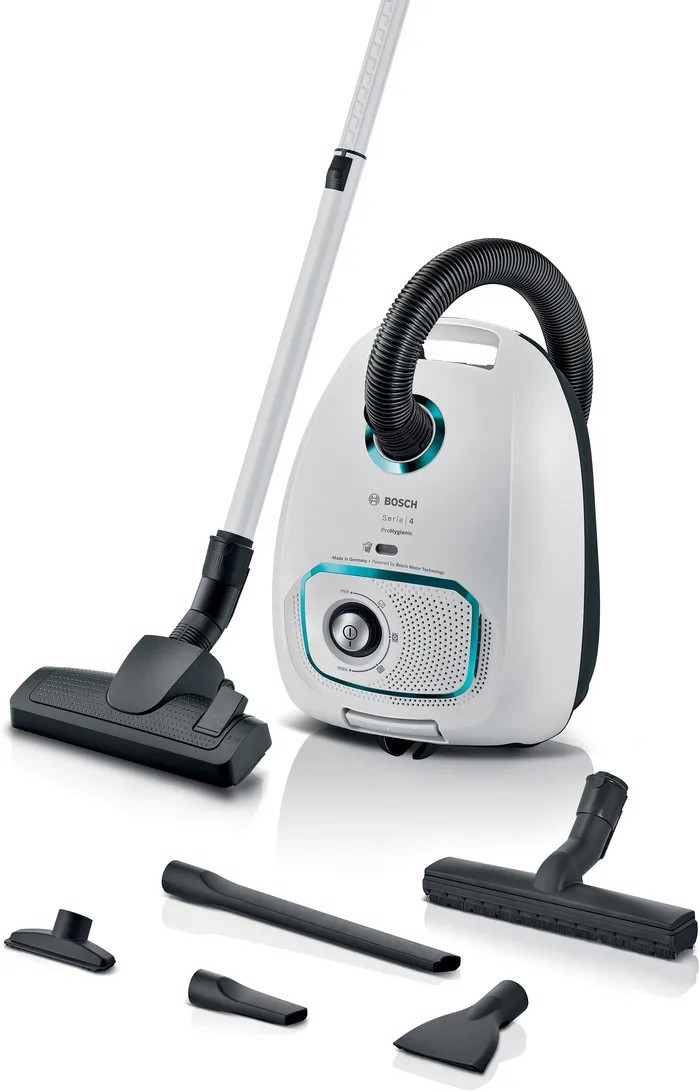 Bosch Serie 4 Aspirapolvere con sacco ProHygienic Bianco, 600 W, A cilindro, Secco, Sacchetto per la polvere, HEPA, Filtro
