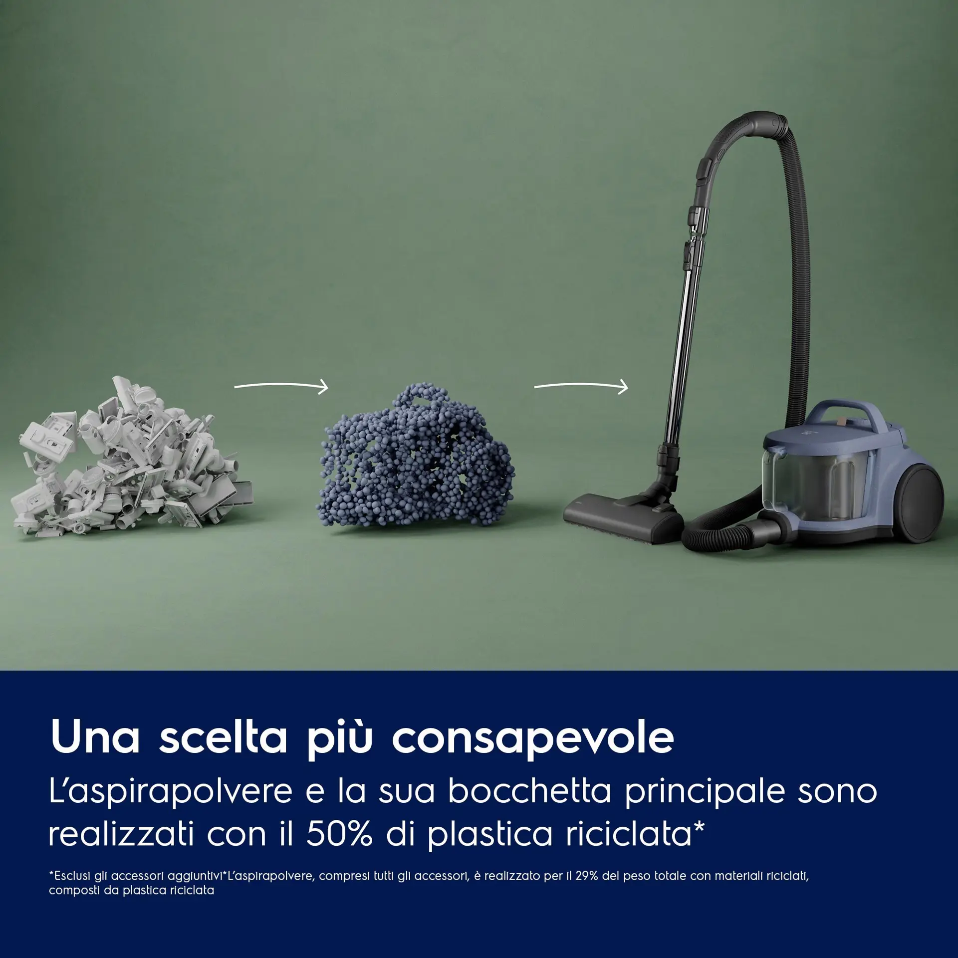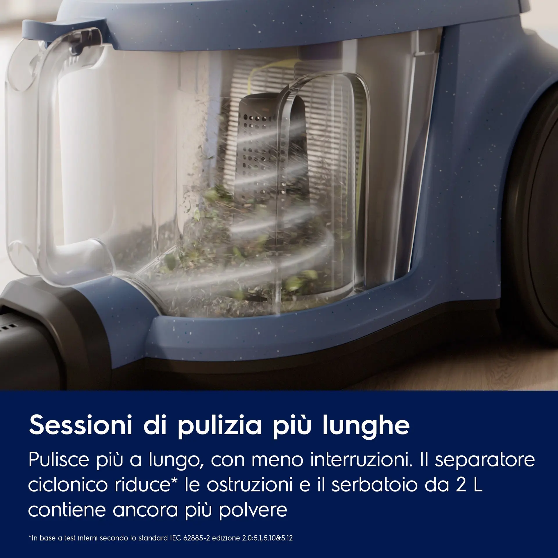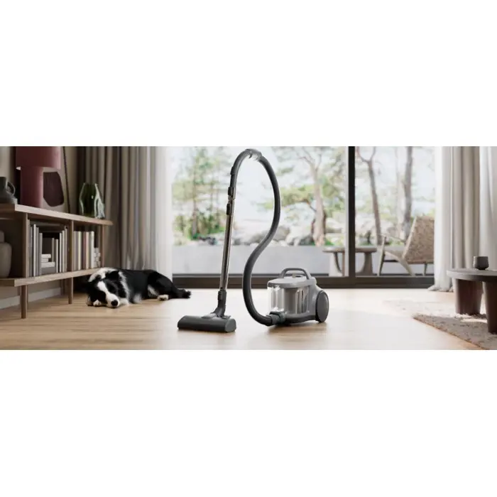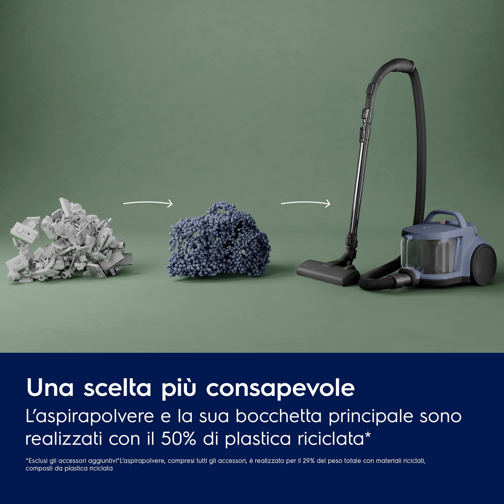 Progettato per i proprietari di animali, questo aspiratore è dotato di una turbo spazzola, di un contenitore da 2L, di un design compatto per un facile stoccaggio e di un separatore ciclonico per evitare intasamenti. La filtrazione HEPA e le plastiche riciclate lo rendono efficiente e sostenibile.