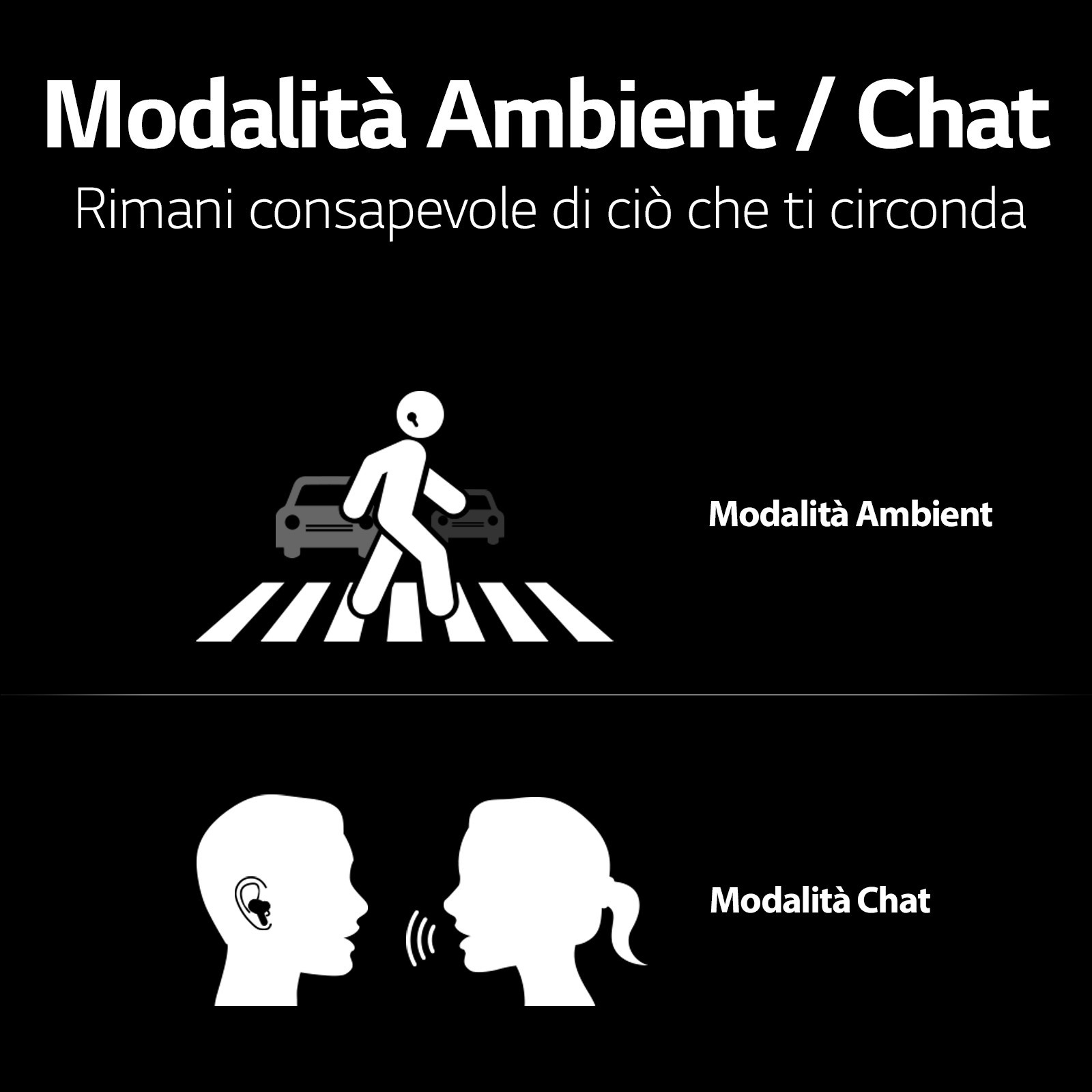Modalità chat: utilissima quando incontri un amico oppure quando devi ordinare qualcosa al bar, perché ti permette di sentire chiaramente la voce della persona con cui stai parlando senza dover togliere gli auricolari.