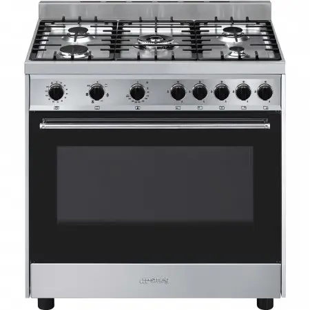 Smeg B901GMXI9. Tipo di prodotto: Piano cottura, Colore del prodotto: Acciaio inossidabile, Tipo di controllo: Manopola. Tipo di piano cottura: Gas, Numero totale elementi piano cottura: 5 Fornello(i), Tipo di gas: Gas naturale. Dimensione del forno: Largo, Sorgente di alimentazione del forno: Elettrico, Capacità netta del forno: 115 L. Classe efficienza energetica: A, Consumo energetico (convenzionale): 1,21 kWh, Potenza aggregata (elettrica): 3200 W. Larghezza: 898 mm, Profondità: 598 mm, Altezza: 915 mm