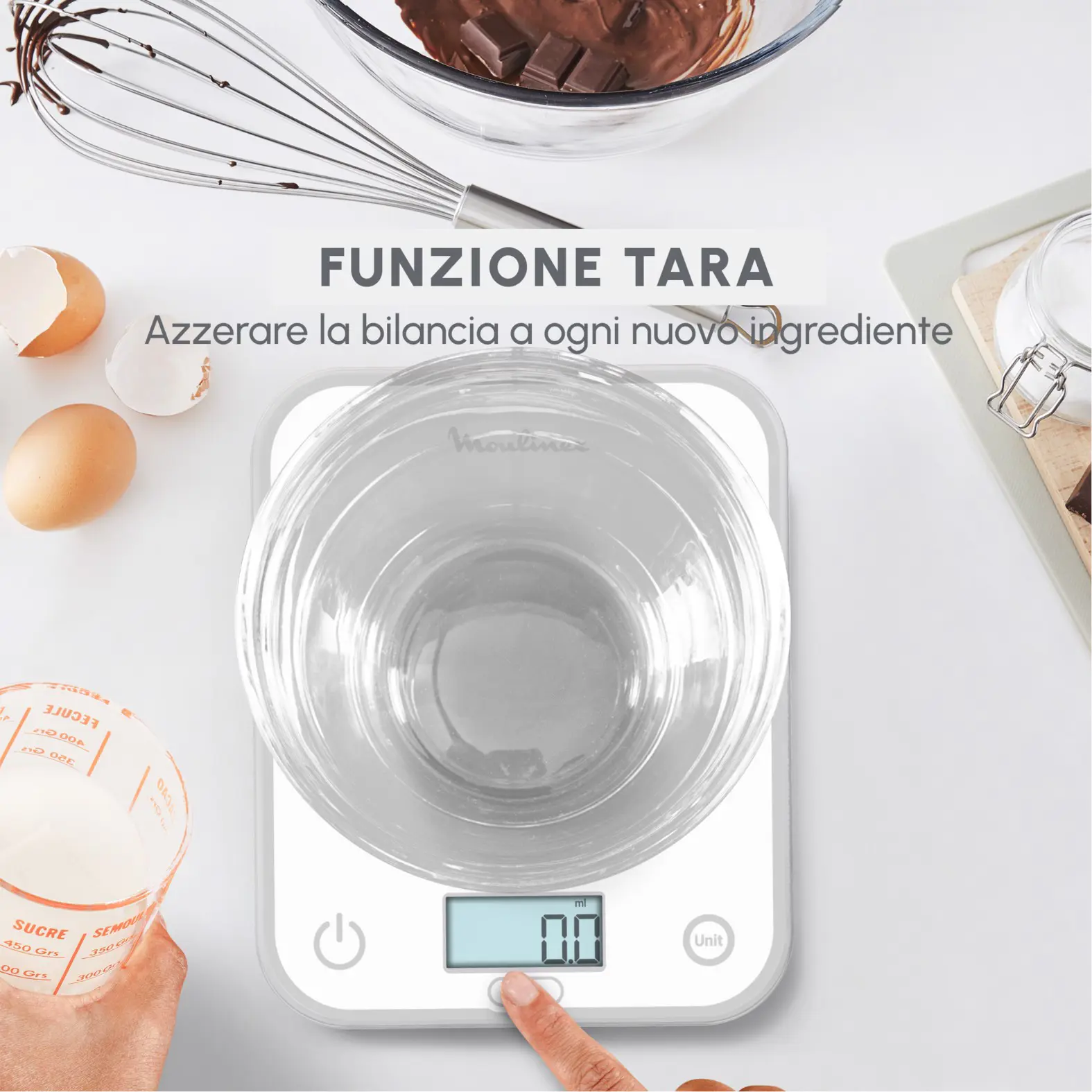 Elevata capacità, incrementi di peso con intervalli di precisione e conversione istantanea delle unità garantiscono risultati impeccabili per tante preparazioni, dai biscotti alle torte. E grazie alla funzione tara intelligente, che consente di azzerare la bilancia a ogni ingrediente, non sarà necessario cambiare contenitore!
