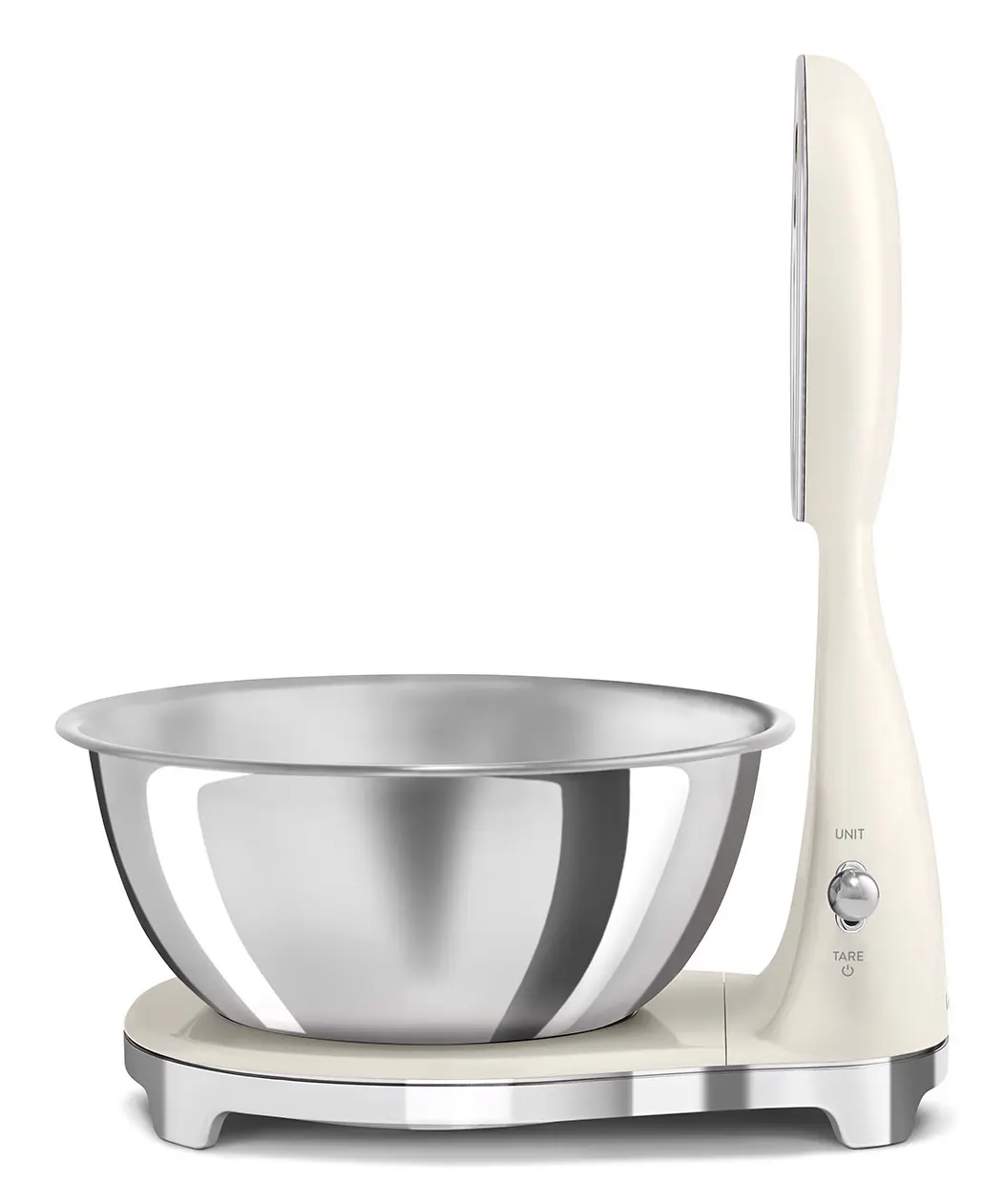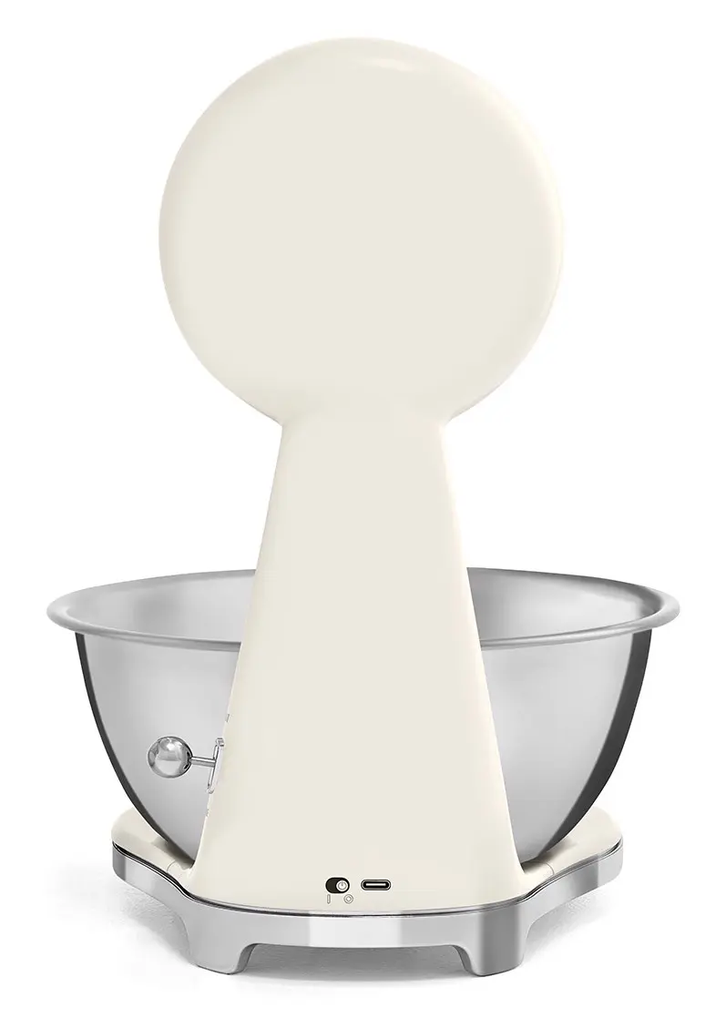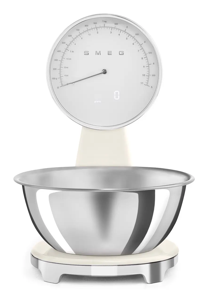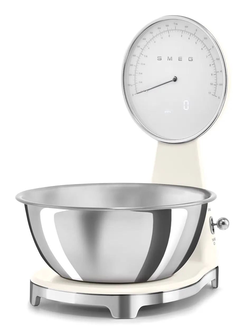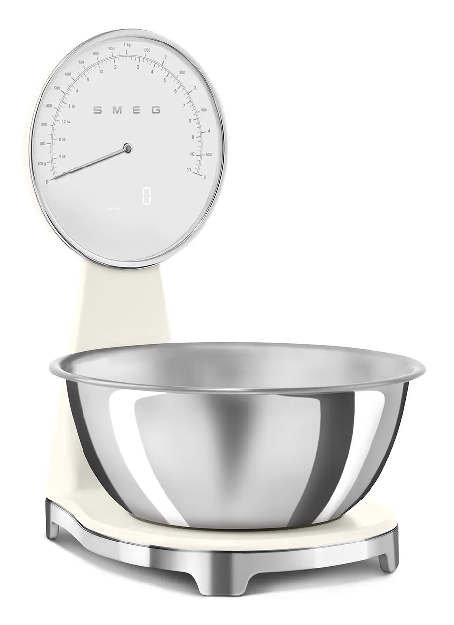 Smeg KSF01CRWW. Tipo: Bilancia da cucina elettronica, Peso massimo (capacità): 5 kg, Precisione: 1 g. Tipo di display: Analog / LCD, Colore retroilluminazione: Bianco. Tipo batteria: Batteria integrata, Tecnologia batteria: Ioni di Litio. Larghezza: 180 mm, Profondità: 250 mm, Altezza: 315 mm. Larghezza imballo: 309 mm, Profondità imballo: 276 mm, Altezza imballo: 385 mm
