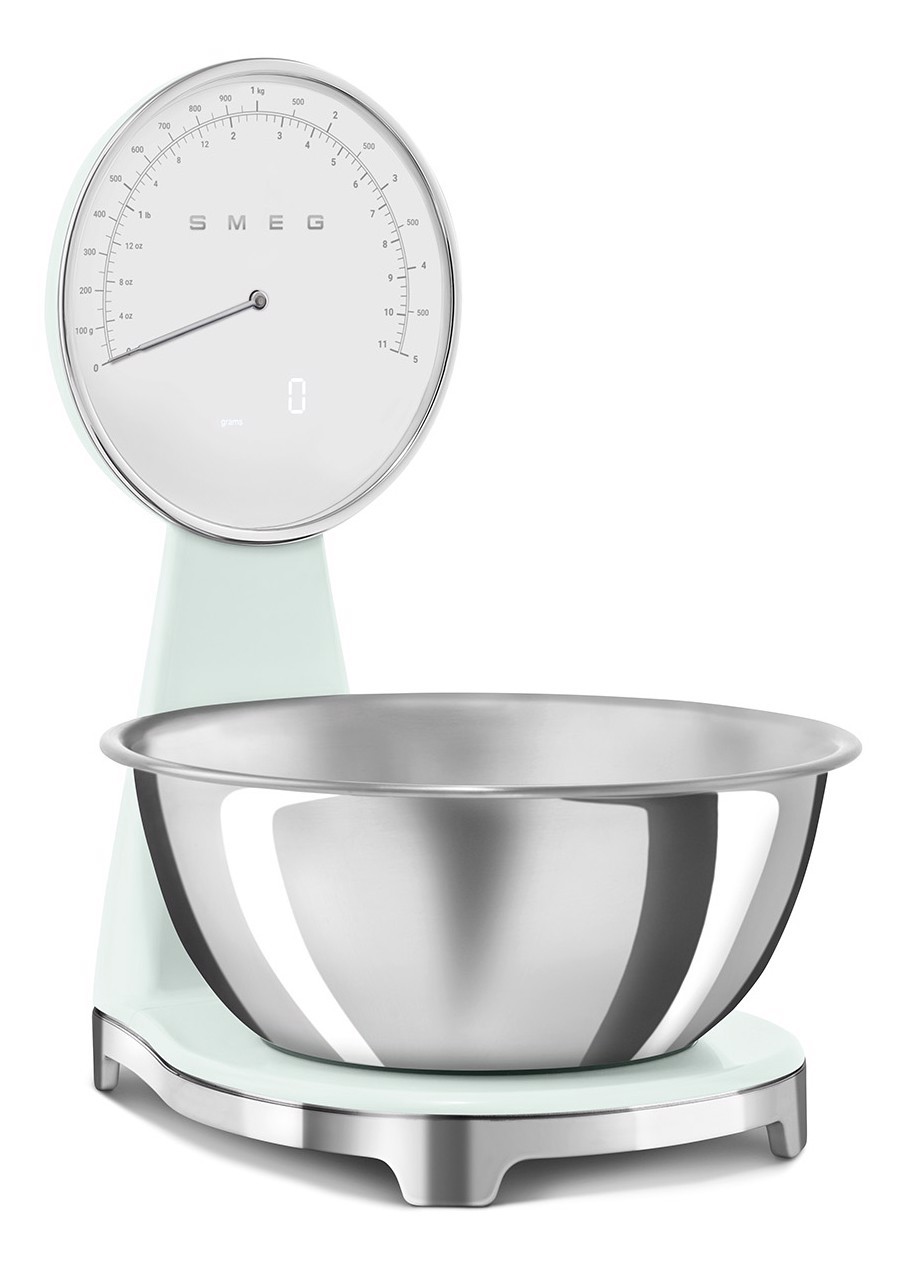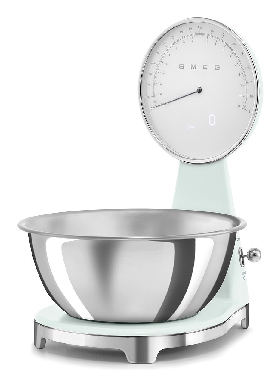 Smeg KSF01PGWW. Tipo: Bilancia da cucina elettronica, Peso massimo (capacità): 5 kg, Precisione: 1 g. Tipo di display: Analog / LCD, Colore retroilluminazione: Bianco. Tipo batteria: Batteria integrata, Tecnologia batteria: Ioni di Litio. Larghezza: 180 mm, Profondità: 250 mm, Altezza: 315 mm. Larghezza imballo: 309 mm, Profondità imballo: 276 mm, Altezza imballo: 385 mm