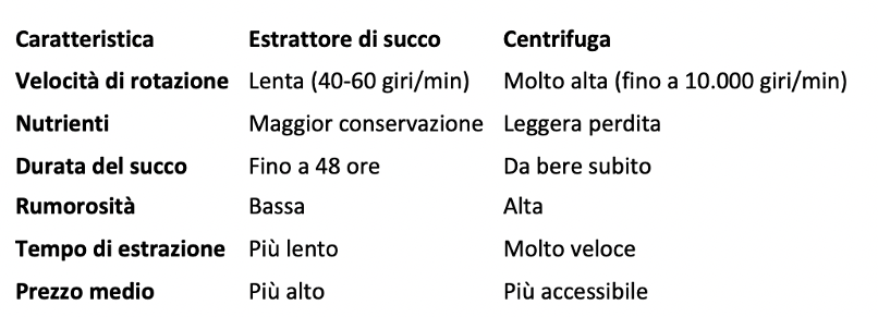 • Se vuoi il massimo della qualità nutrizionale, se consumi spesso succhi di verdure a foglia o se desideri conservarli più a lungo, meglio optare per un estrattore; • Se preferisci velocità, semplicità e hai a disposizione un budget più contenuto, meglio la centrifuga.