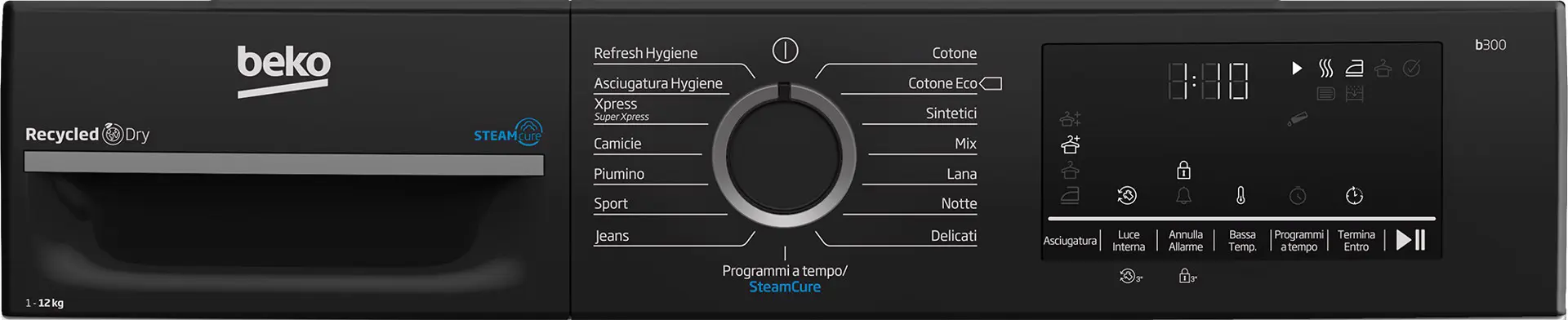 Beko BMGT4122SBI: Asciugatrice 12kg, classe E, inverter, Libera installazione, Caricamento frontale, Pompa di calore, Nero, Bianco, Manopola, Touch, Destra