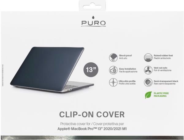 La cover Clip-On, compatibile con MacBook Pro 13" del 2020 e MacBook Pro 13" M1 del 2021, è perfetta per proteggere il tuo PC Apple valorizzando l’inconfondibile design del MacBook, senza nascondere le sue linee essenziali ed eleganti. La cover Clip-On, con doppia protezione per la parte superiore e per la parte inferiore del MacBook Pro 13”, è dotata di piedini antiscivolo ed inoltre, grazie alle sue aperture, non nasconde le porte USB, le spie ed i pulsanti. Disponibile sia nella variante completamente trasparente che nella versione nera semi-trasparente, il suo profilo Ultra Slim la rende una cover estremamente elegante e maneggevole. Inoltre sulla base presenta dei fori che permettono al MacBook il passaggio d’aria, evitando così il surriscaldamento. Questa cover è compatibile con i seguenti modelli di MacBook Pro 13" (2020): MacBook Pro (13 pollici, 2020, quattro porte Thunderbolt 3) MWP42xx/A, MWP52xx/A, MWP62xx/A, MWP72xx/A, MWP82xx/A MacBook Pro (13 pollici, M1, 2020) MYD83xx/A, MYD92xx/A, MYDA2xx/A, MYDC2xx/A MacBook Pro (13 pollici, 2020, due porte Thunderbolt 3) MXK32xx/A, MXK52xx/A, MXK62xx/A, MXK72xx/A La custodia consente un'apertura di 130° del pc ideale per non stancare la vista in caso di utilizzo continuativo del monitor. Mostra il tuo MacBook: ClipOn non nasconde, ma protegge! Se cerchi una custodia MacBook per proteggere il tuo Apple device, ma non vuoi nasconderne le linee e il suo design unico ed eccezionale, Puro ha quello che fa per te! Hai mai visto tanto stile e ricercatezza in una custodia per MacBook? Ricercatezza e semplicità in un unico accessorio: per gli amanti del MacBook la cover ClipOn è l'accessorio indispensabile! Sottile, trasparente e discreta sono le parole chiave per chi ambisce ad un MacBook esclusivo ed elegante! Straordinario nel suo design, il MacBook è per tutti gli Apple Lover un prezioso accessorio Tech che si vorrebbe custodire come nuovo! Chi ne possiede uno sa bene quanto è rischioso trovare fastidiosi micro graffi che, seppur non molto visibili, ci sono. Con la cover ClipOn graffi ed urti saranno solo un lontano ricordo! Si potrà adagiare il MacBook su qualsiasi superficie, o trasportarlo tranquillamente all'interno dello zaino porta PC. Collega liberamente tutte le porte E' possibile collegare tutte le porte del MacBook anche con la cover ClipOn installata, grazie agli appositi fori che ne consentono il collegamento. Ti serve un Cavo di ricarica? Da Puro puoi trovare anche quello! Collega liberamente tutte le porte E' possibile collegare tutte le porte del MacBook anche con la cover ClipOn installata, grazie agli appositi fori che ne consentono il collegamento. Ti serve un Cavo di ricarica? Da Puro puoi trovare anche quello! Respirare è fondamentale anche per il MacBook: favorisci il circolo d'aria con la cover ClipOn L'uso continuo e prolungato del computer può portar al suo surriscaldamento, perché le ventole di areazione non sono in grado di raffreddare a sufficienza i circuiti e questo potrebbe portare al rallentamento delle prestazioni del proprio MacBook. La custodia per MacBook ClipOn consente la ventilazione grazie alle aperture nella scocca inferiore. A favorirne la ventilazione sono anche i piedini antiscivolo che permettono al MacBook di rimanere leggermente sollevato dalla superficie su cui è adagiato e consentono una perfetta stabilità. A favorirne la ventilazione sono anche i piedini antiscivolo che permettono al MacBook di rimanere leggermente sollevato dalla superficie su cui è adagiato e consentono una perfetta stabilità. Ecco come installare la cover MacBook ClipOn Scopri le facili mosse che consentono di proteggere definitivamente il tuo computer