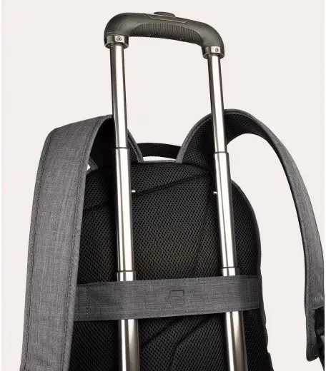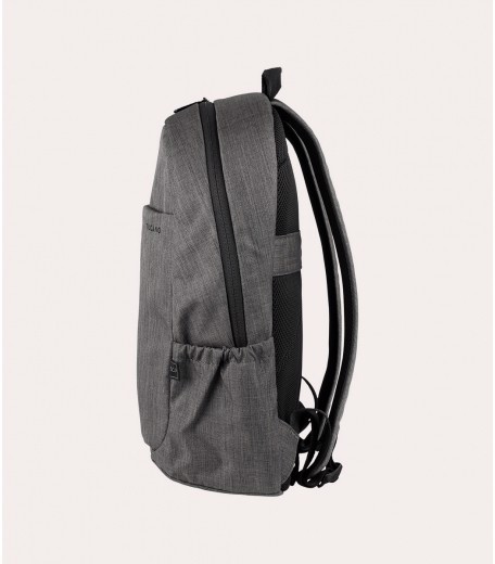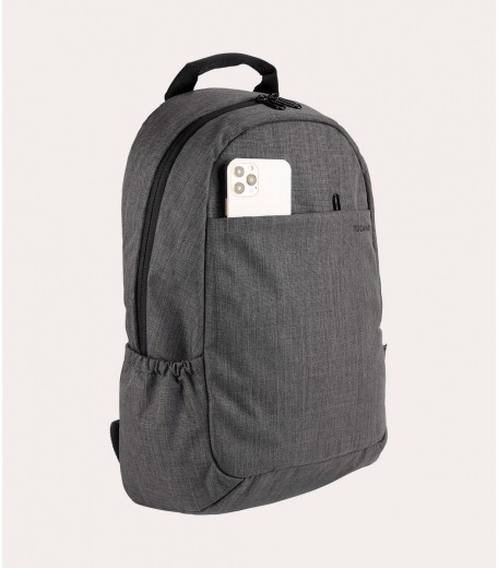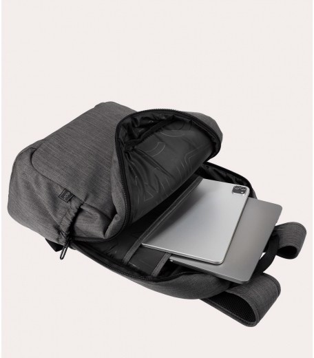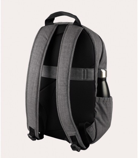 Zaino per laptop fino a 15.6" e MacBook Pro 16" realizzato in tessuto mélange ottenuto dalla plastica riciclata. Il vano interno, comodo e capiente, è dotato di doppia tasca protettiva per laptop e tablet. Gli spallacci imbottiti e regolabili, lo schienale ergonomico e la tasca frontale esterna, lo rendono comodo e utile sia per il lavoro sia per il tempo libero. Sullo schienale vi è una fascia per l'aggancio al trolley.