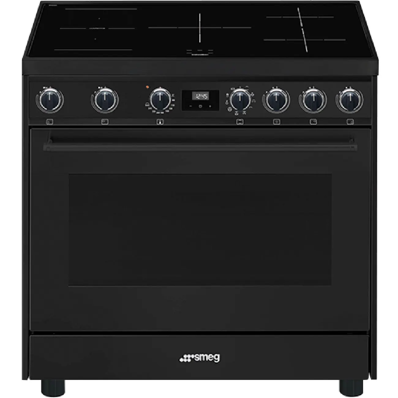 Smeg C91IEA9. Tipo di prodotto: Piano cottura, Colore del prodotto: Nero, Tipo di controllo: Manopola, Touch. Tipo di piano cottura: Piano cottura a induzione, Numero totale elementi piano cottura: 5 Fornello(i). Dimensione del forno: Largo, Capacità netta del forno: 115 L, Potenza grill: 2900 W. Classe efficienza energetica: A, Consumo energetico (convenzionale): 0,98 kWh, Potenza aggregata (elettrica): 10600 W. Larghezza: 900 mm, Profondità: 600 mm, Altezza: 900 mm