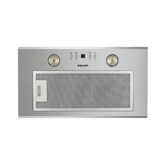 Glem Gas GHF545IX. Potenza massima di estrazione: 500 m³/h, Tipo di estrazione: Filtrante, Classe di efficienza dinamica del fluido: D. Tipo: Cappa aspirante a parete, Colore del prodotto: Grigio, Illuminamento: 104,85 lx. Classe efficienza energetica: C, Potenza motore: 150 W, Consumo energetico annuo: 72,4 kWh. Larghezza: 520 mm, Profondità: 275 mm, Altezza (min.): 28,6 cm. Larghezza imballo: 620 mm, Profondità imballo: 320 mm, Altezza imballo: 370 mm
