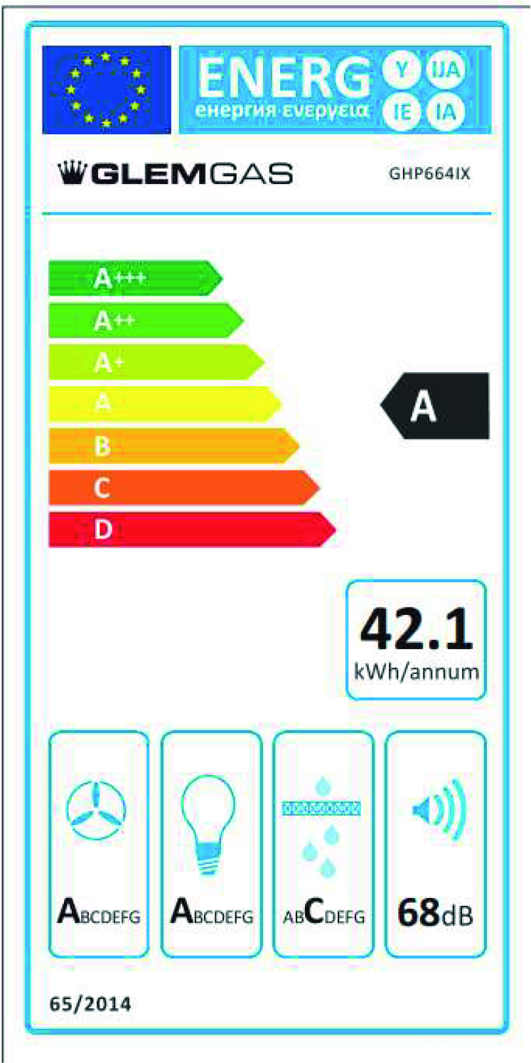 Glem Gas GHP664IX. Potenza massima di estrazione: 729 m³/h, Tipo di estrazione: Aspirante, Classe di efficienza dinamica del fluido: A. Tipo: Cappa aspirante a parete, Colore del prodotto: Acciaio inossidabile, Potenza lampadina: 4 W. Tipo di filtro antigrasso: Metallo/Carbone. Classe efficienza energetica: A, Consumo energetico annuo: 42,1 kWh, Scala di efficienza energetica: Da A+++ a G. Larghezza: 600 mm, Profondità: 500 mm, Altezza (min.): 40 cm