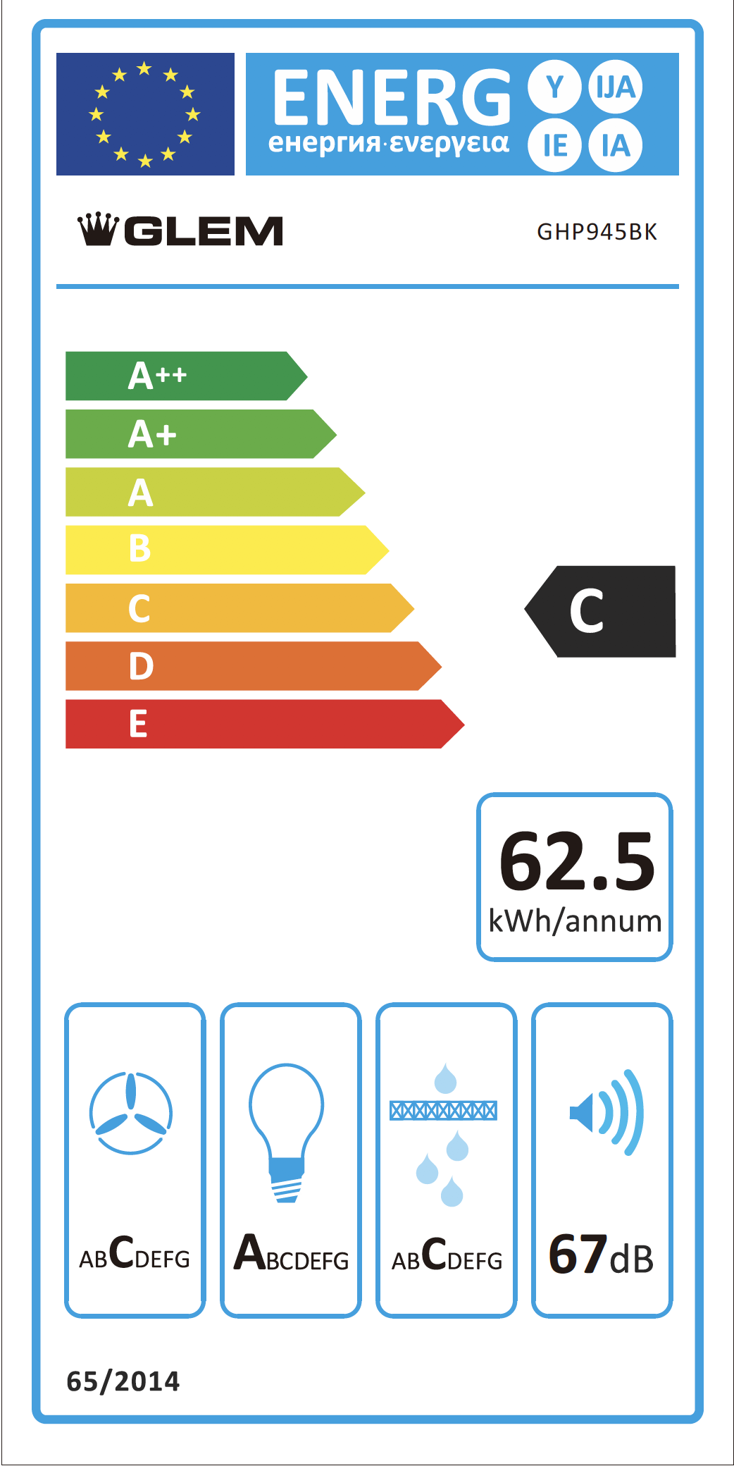 Glem Gas GHP945BK, 498 m³/h, Aspirante/Filtrante, C, A, C, 67 dB