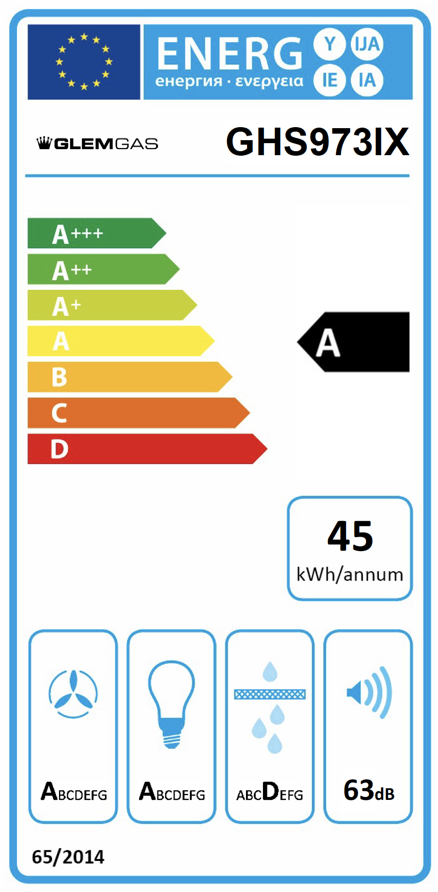 Glem Gas GHS973IX, 679 m³/h, A, A, D, 63 dB, 48 dB