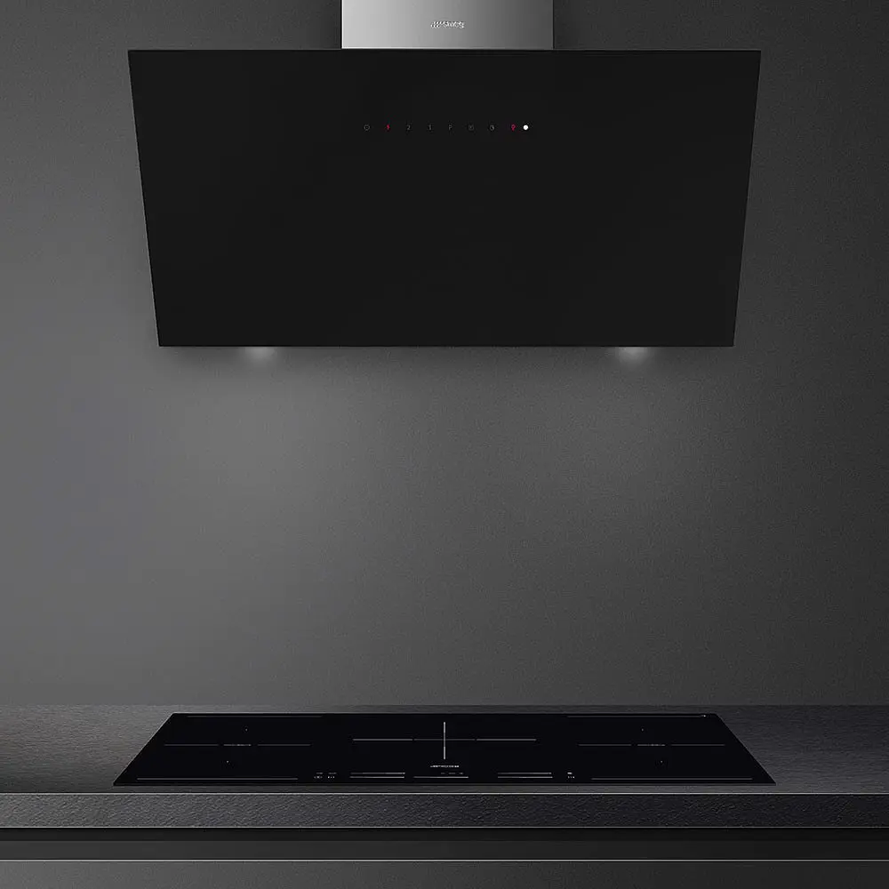 Smeg KICV90BL. Potenza massima di estrazione: 720 m³/h, Tipo di estrazione: Aspirante, Classe di efficienza dinamica del fluido: A. Tipo: Cappa aspirante a parete, Colore del prodotto: Nero, Grigio, Materiale della scocca: Vetro. Tipo di filtro antigrasso: Alluminio, Numero di filtri: 2 pz. Classe efficienza energetica: A+, Consumo energetico annuo: 41 kWh, Carico di collegamento: 272 W. Larghezza: 898 mm, Profondità: 378 mm, Altezza: 1032 mm