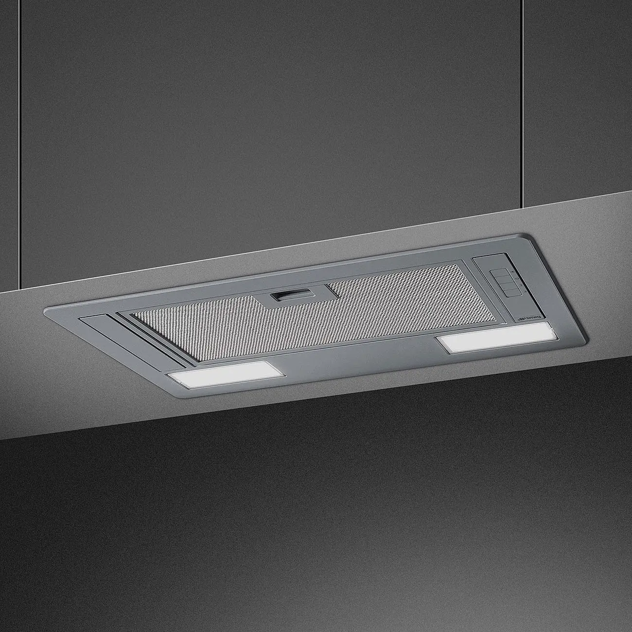 Smeg KSG52HE. Potenza massima di estrazione: 368 m³/h, Classe di efficienza dinamica del fluido: E, Classe di efficienza luminosa: D. Tipo: Integrato, Colore del prodotto: Argento, Potenza lampadina: 3 W. Tipo di filtro antigrasso: Alluminio, Numero di filtri: 1 pz. Classe efficienza energetica: D, Consumo energetico annuo: 71 kWh, Carico di collegamento: 146 W. Larghezza: 534 mm, Profondità: 300 mm, Altezza: 208 mm
