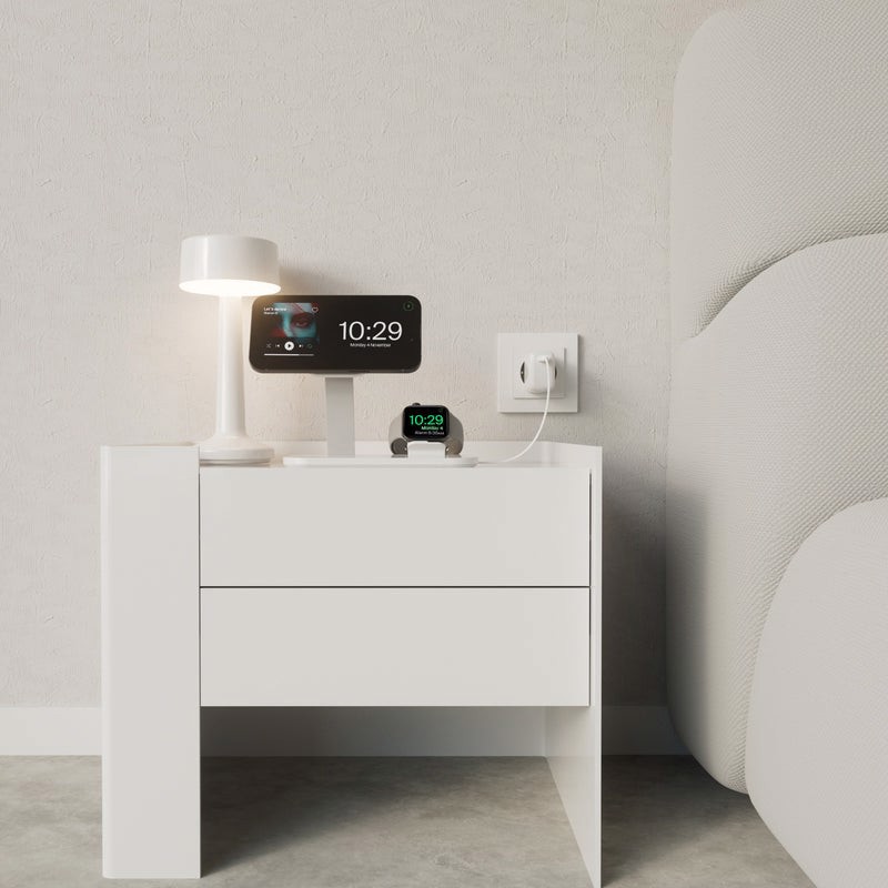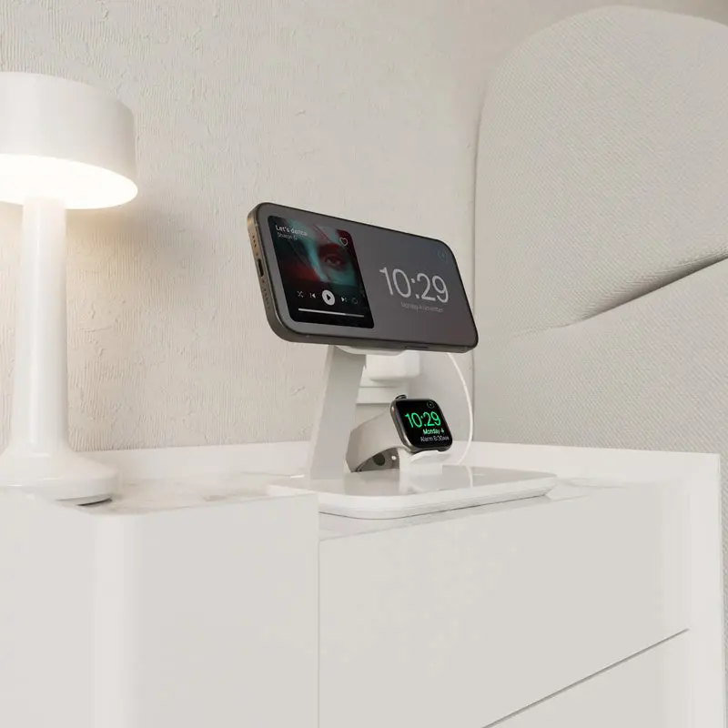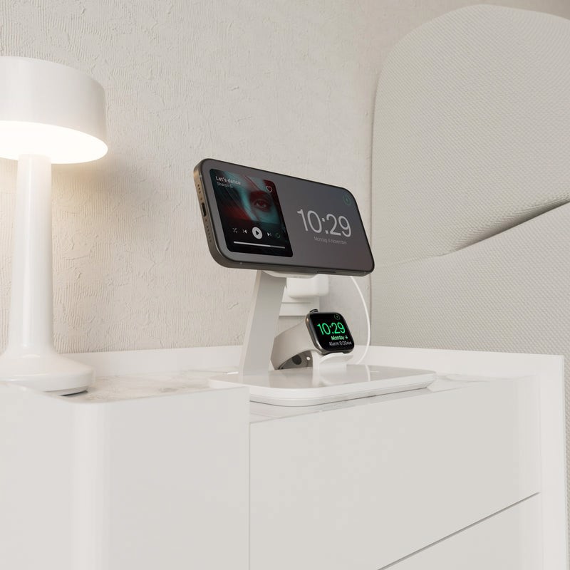 Il braccio verticale è compatibile con la tecnologia MagSafe e carica l’iPhone con una potenza massima di 15W, mentre alla base del supporto è possibile ricaricare gli AirPods in modalità wireless. Il supporto Mag Station 3 in 1 è dotato anche di una porta USB-A da 5W che permette la ricarica di un terzo device, e di un supporto rimovibile per il posizionamento del cavo magnetico dell’Apple Watch .