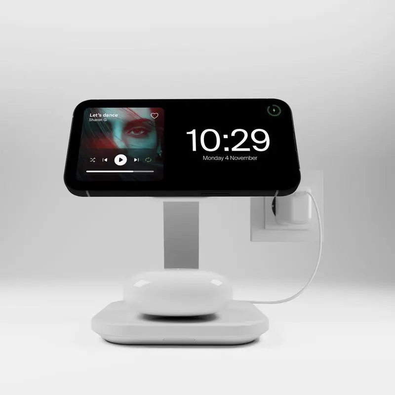 Il braccio verticale è compatibile con la tecnologia MagSafe e carica l’iPhone con una potenza massima di 15W, mentre alla base del supporto è possibile ricaricare gli AirPods in modalità wireless.
