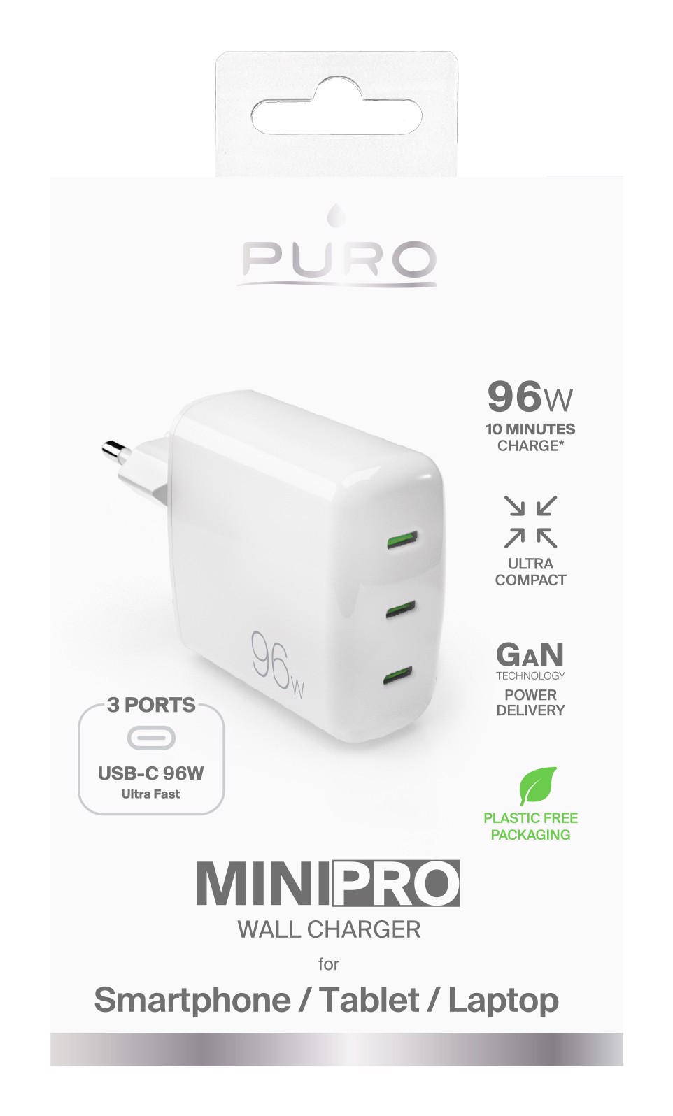 Sei alla ricerca di un caricabatterie da parete dalle prestazioni uniche, performanti e sicure, e che ti permetta di caricare più di un device contemporaneamente? Abbiamo proprio quello che fa per te! Il caricabatterie da parete MiniPro 96W di Puro è la soluzione ideale per caricare in velocità e in totale sicurezza tre dispositivi, fornendo una soluzione di ricarica flessibile e versatile. Dalle dimensioni ridotte e compatte e con tecnologia GaN, è dotato di tre porte USB-C con le quali è possibile caricare due dispositivi con un’erogazione totale di 96W. L’innovativa tecnologia GaN permette di dissipare il calore evitando surriscaldamenti, e assieme alla tecnologia Power Delivery delle tre porte USB-C offrono elevate prestazioni di ricarica. MiniPro 96W è la soluzione universale perfetta per la ricarica di tutti i tuoi dispositivi: un unico caricabatterie da parete per tutti i tuoi smartphone, tablet e laptop. E grazie al design leggero e compatto, il caricatore è facile da trasportare ovunque. La ricarica è estremamente veloce, consente di raggiungere il 100% della batteria dello smartphone in soli 10 minuti, del tablet in soli 20 minuti, e del laptop in 30 minuti*. Scegli la massima potenza, il massimo risparmio di tempo e il massimo risparmio di spazio con caricatore da parete MiniPro da96W: non tornerai più indietro!