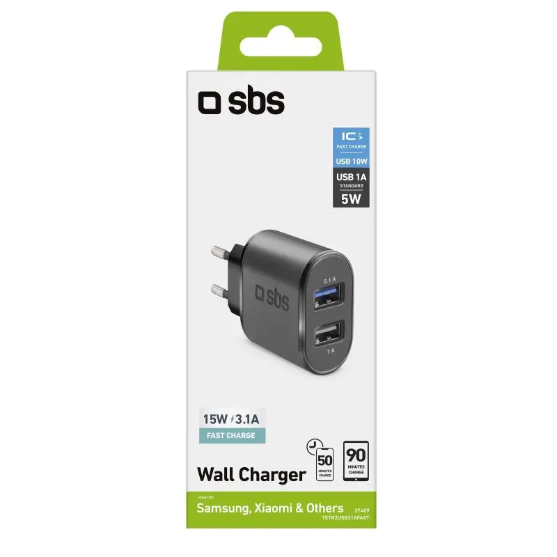 SBS Caricabatterie caricatore 15 Watt - Ricarica rapida con due porte USB