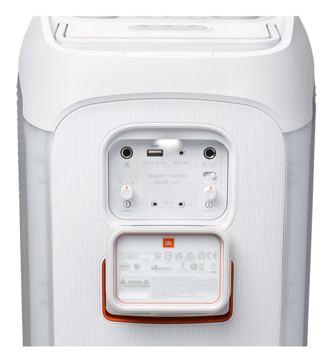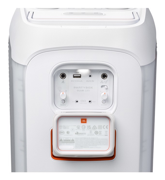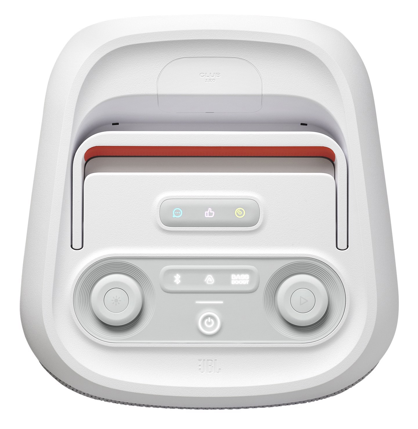 JBL PartyBox Club 120. Diametro del tweeter: 5,71 cm (2.25"), Diametro del tweeter: 5,7 cm, Diametro del woofer: 13,3 cm (5.25"). Potenza in uscita (RMS): 160 W, Range di frequenza: 40 - 20000 Hz, Rapporto segnale/rumore (SNR): 80 dB. Tecnologia di connessione: Con cavo e senza cavo, Range di frequenza: 2,4 - 2,4835 GHz, Profili Bluetooth: A2DP, AVRCP. Tipo di prodotto: Altoparlante da festa, Colore del prodotto: Bianco. Utilizzo raccomandato: Universale, Formati audio supportati: FLAC, MP3, WAV, WMA