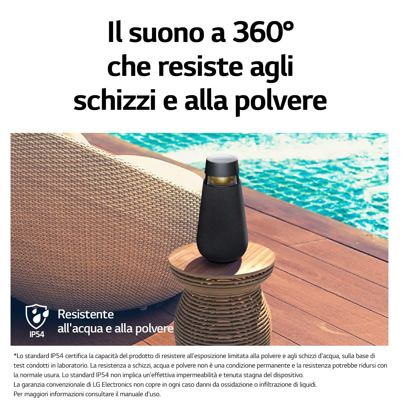 *La certificazione IP54 indica la protezione parziale contro l'ingresso di polvere e la protezione dall'ingresso di schizzi d'acqua. Non immergere in acqua di mare, in piscina o in altri liquidi con concentrazioni saline. La certificazione IP54 non implica impermeabilità.